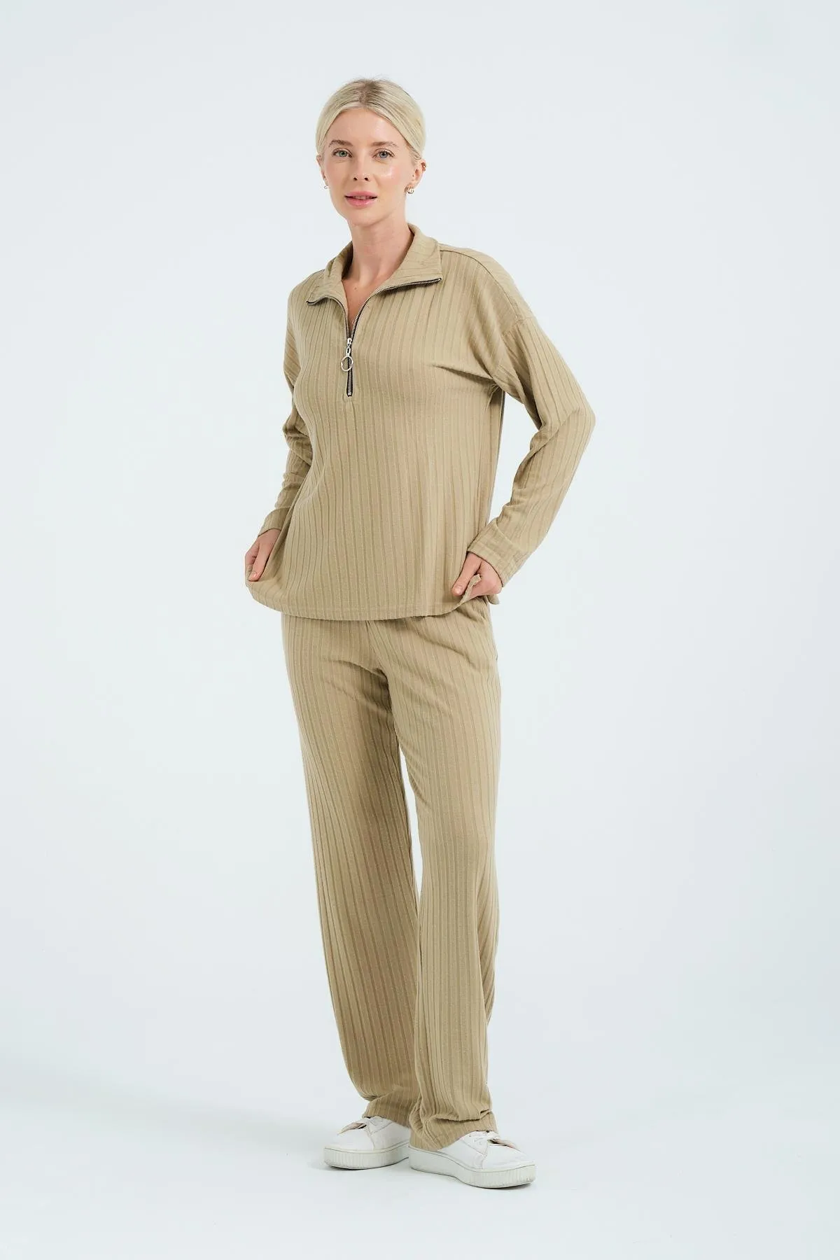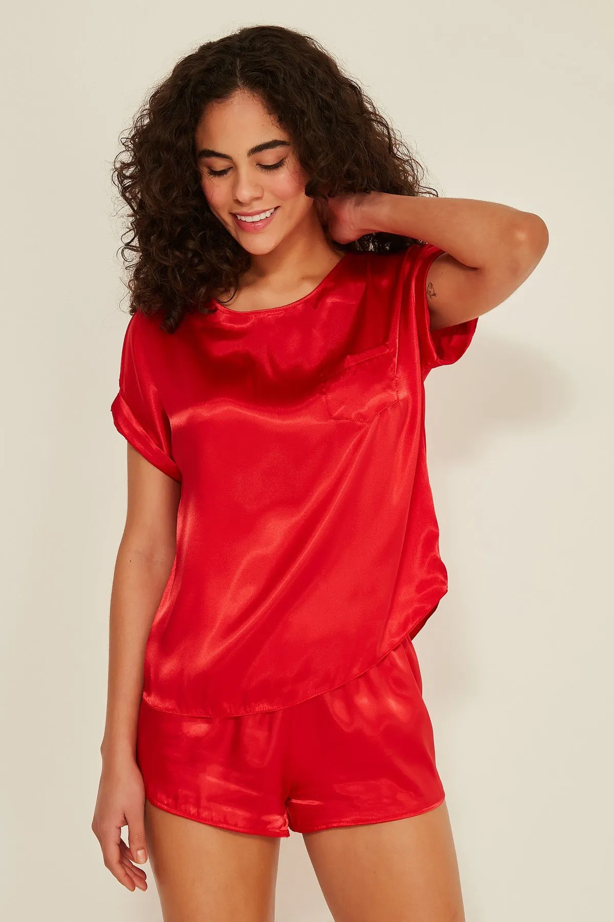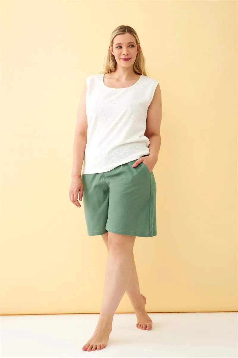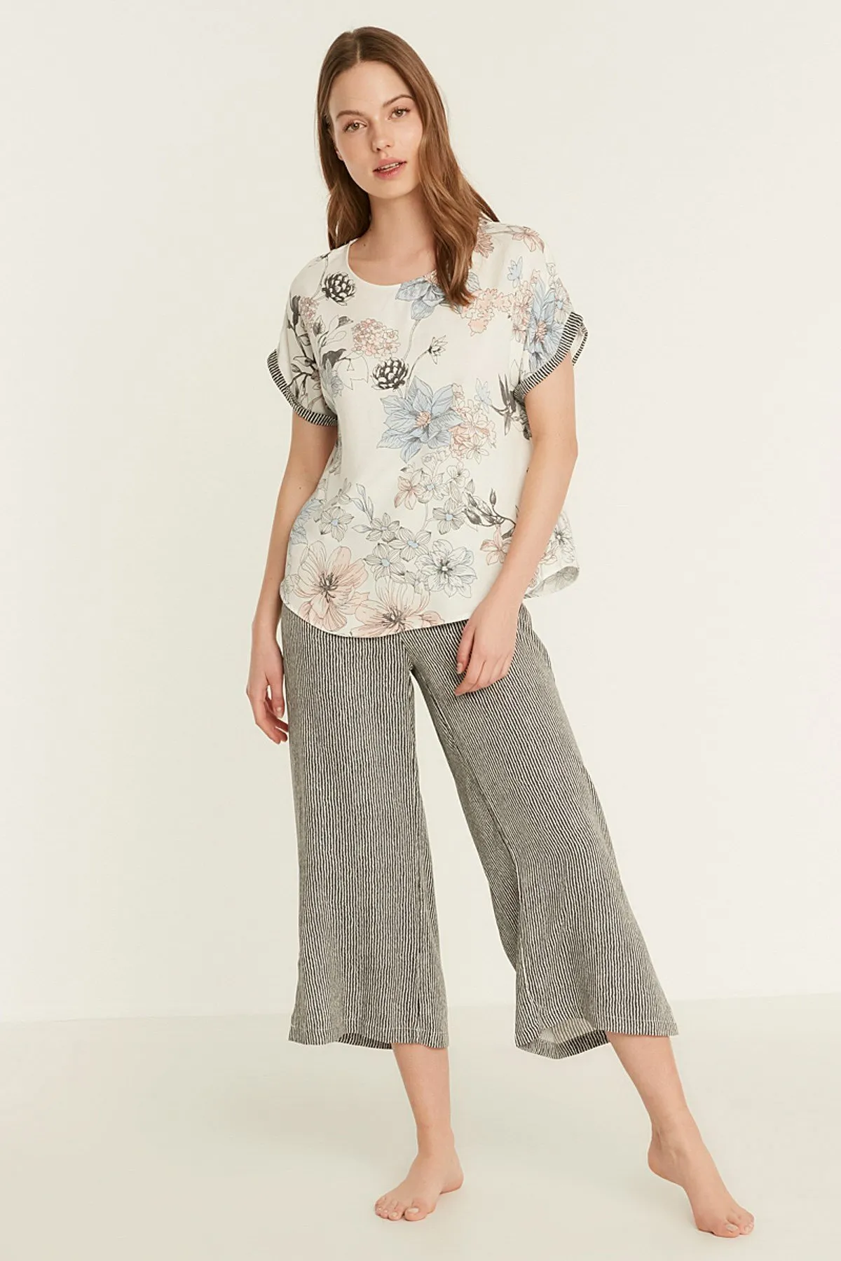 طقم البيجاما بأكمام قصيرة مع ياقة دائرية وحزام خصر مطاطي لملاءمة مريحة وسهلة. مثالي للاسترخاء أو الاستراحة، يقدم إطلالة بسيطة وأنيقة للاستخدام اليومي، ويُعد خيارًا مثاليًا لأيام وليالي الصيف الدافئة.