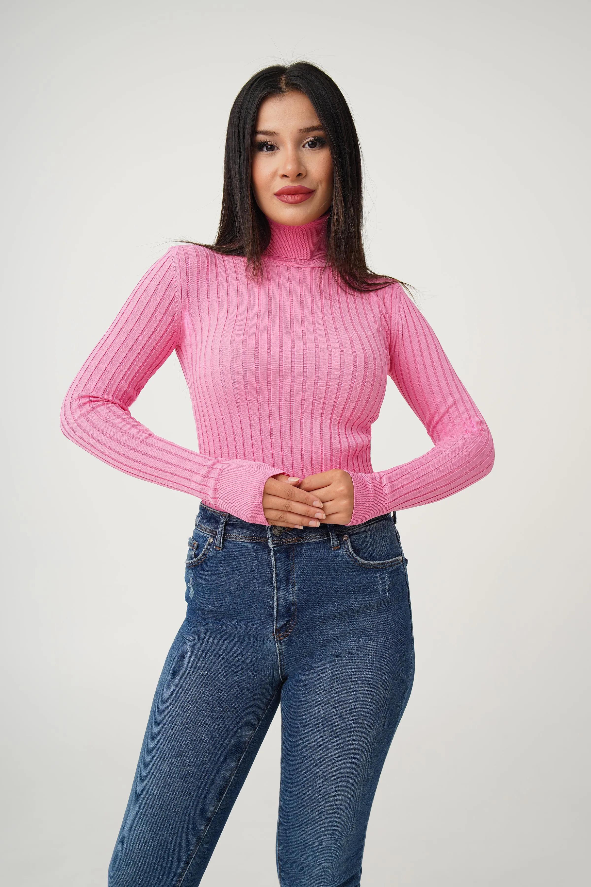 بلوزة شفافة مريحة بياقة عالية وقماش ليكرا مرن تعطي قصة محددة ولوك يومي عصري للخريف والشتاء.