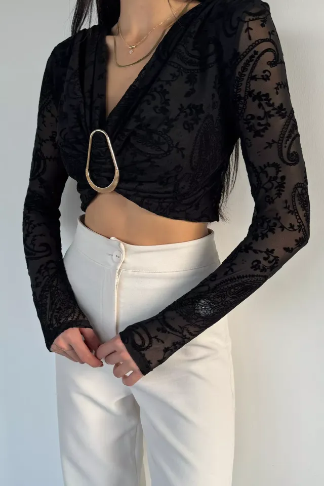 بلوزة كروب ملفوفة بأكمام منفوخة وترتر مع شراشيب للنساء - Beyond Store