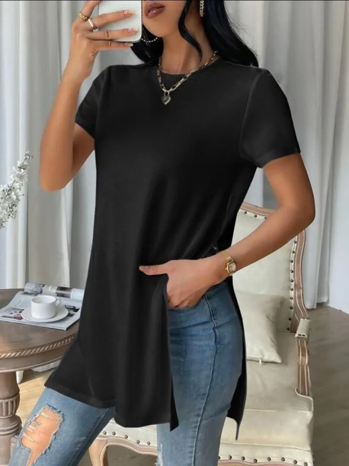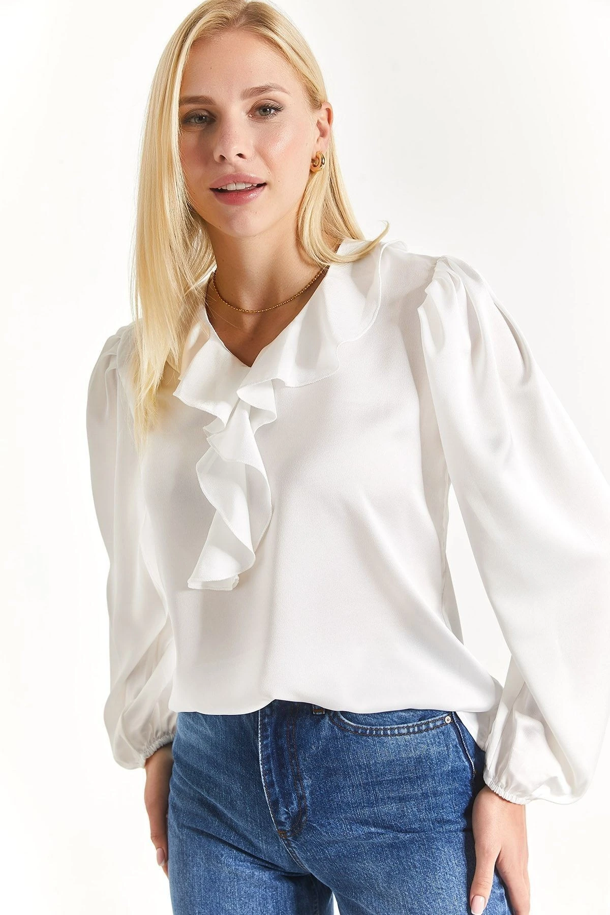بلوزة كروب مريحة بأكمام منفوخة وتصميم ملفوف مع ترتر وتفصيلة شراشيب لستايل يومي صيفي عصري وشيك.