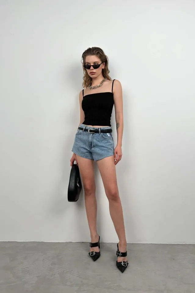 بلوزة قصيرة نسائية مريحة بقصة عادية وتفصيل عقد وياقة دائرية لستايل يومي عصري صيفي.