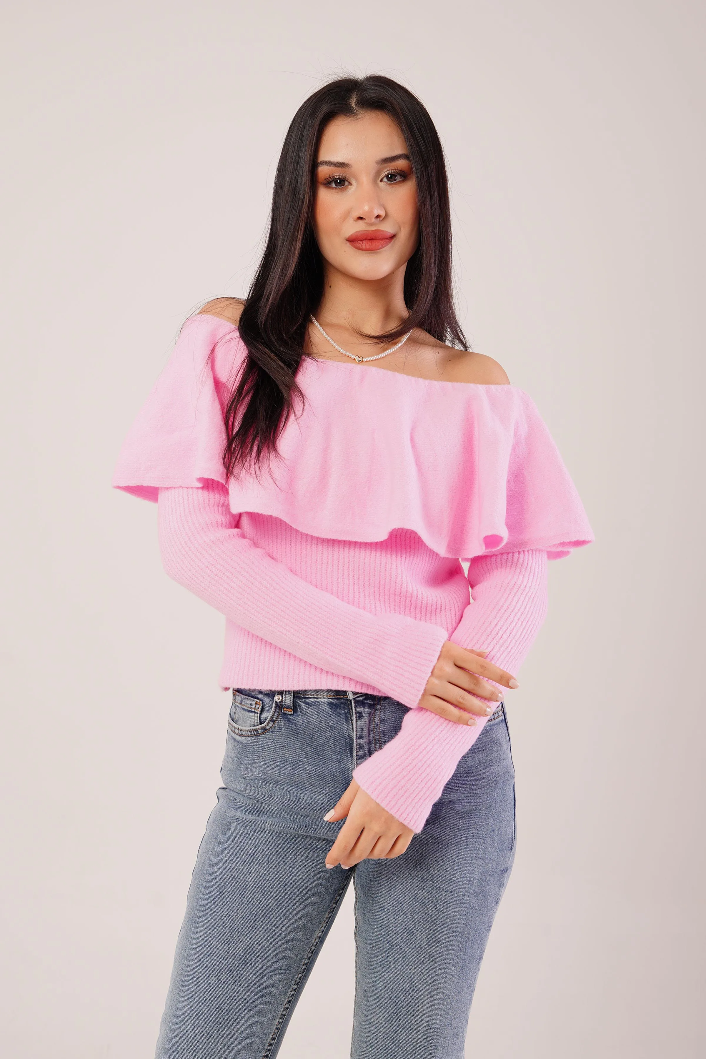 بلوزة مريحة بأكمام طويلة وقصة أكمام إسباني مع نصف ياقة عالية ولمسة أكسسوار لستايل يومي عصري وكيوت.