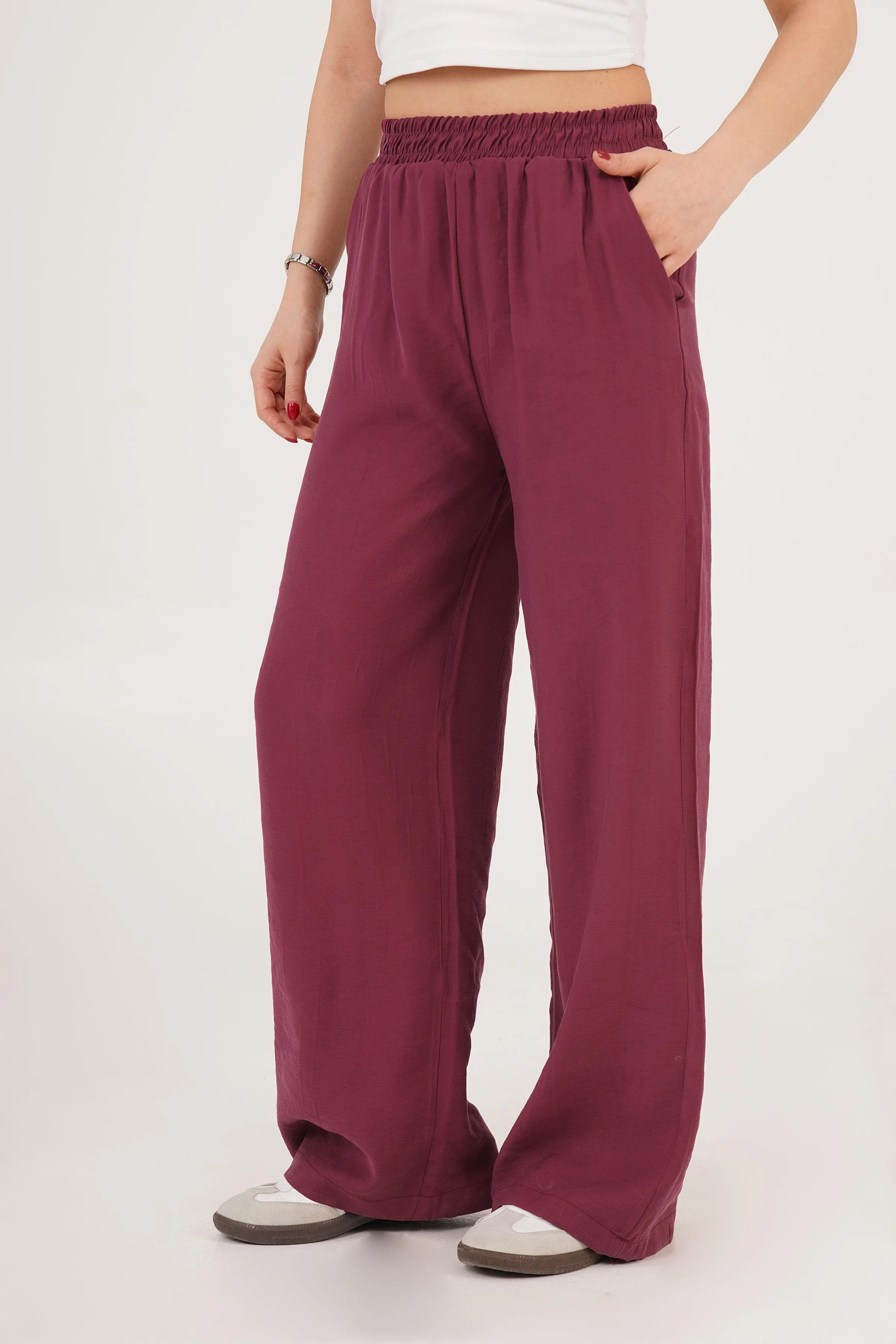 بنطلون نسائي مريح بخصر عالي وقصة ضيقة مع تفاصيل سلسلة لإطلالات كاجوال أنيقة لصيف وربيع.