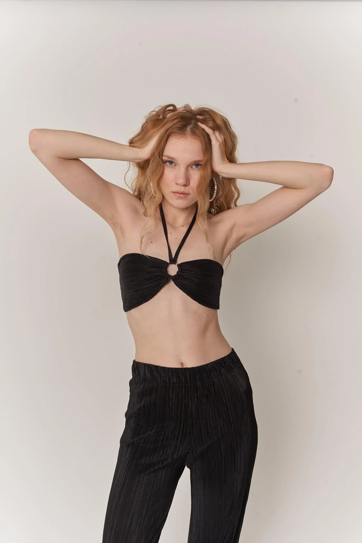 بلوزة قصيرة نسائية مريحة بقصة عادية وتفصيل عقد وياقة دائرية لستايل يومي عصري صيفي.