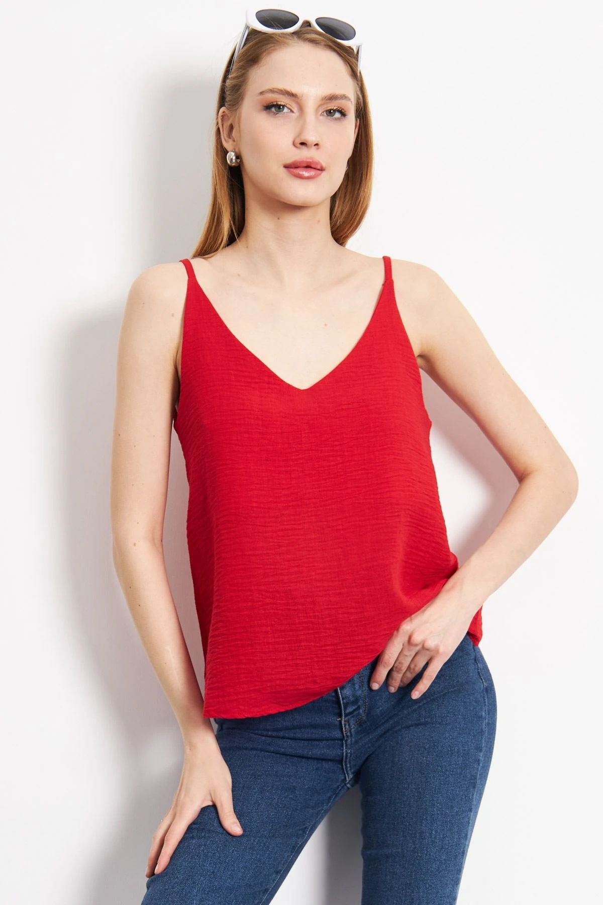 بلوزة بأكمام منفوخة وتصميم مزدوج الصدر ولمعة ترتر وخصر مرن لستايل يومي صيفي عصري وشيك.