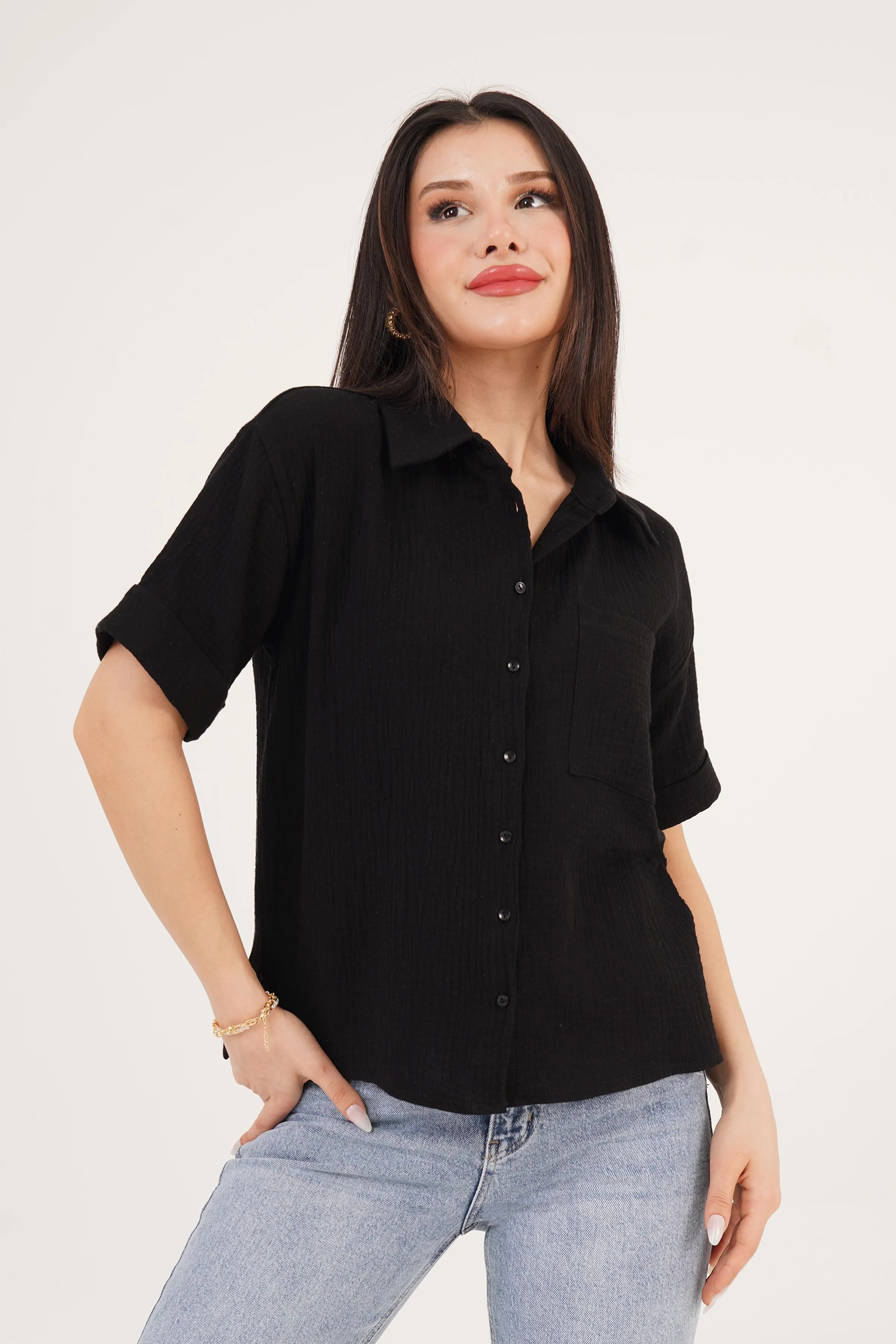 قميص منقوش بأكمام بالون مريح وياقة كلاسيكية وإغلاق بأزرار لإطلالة صيفية شيك يومية.