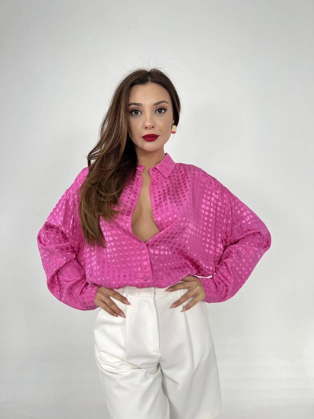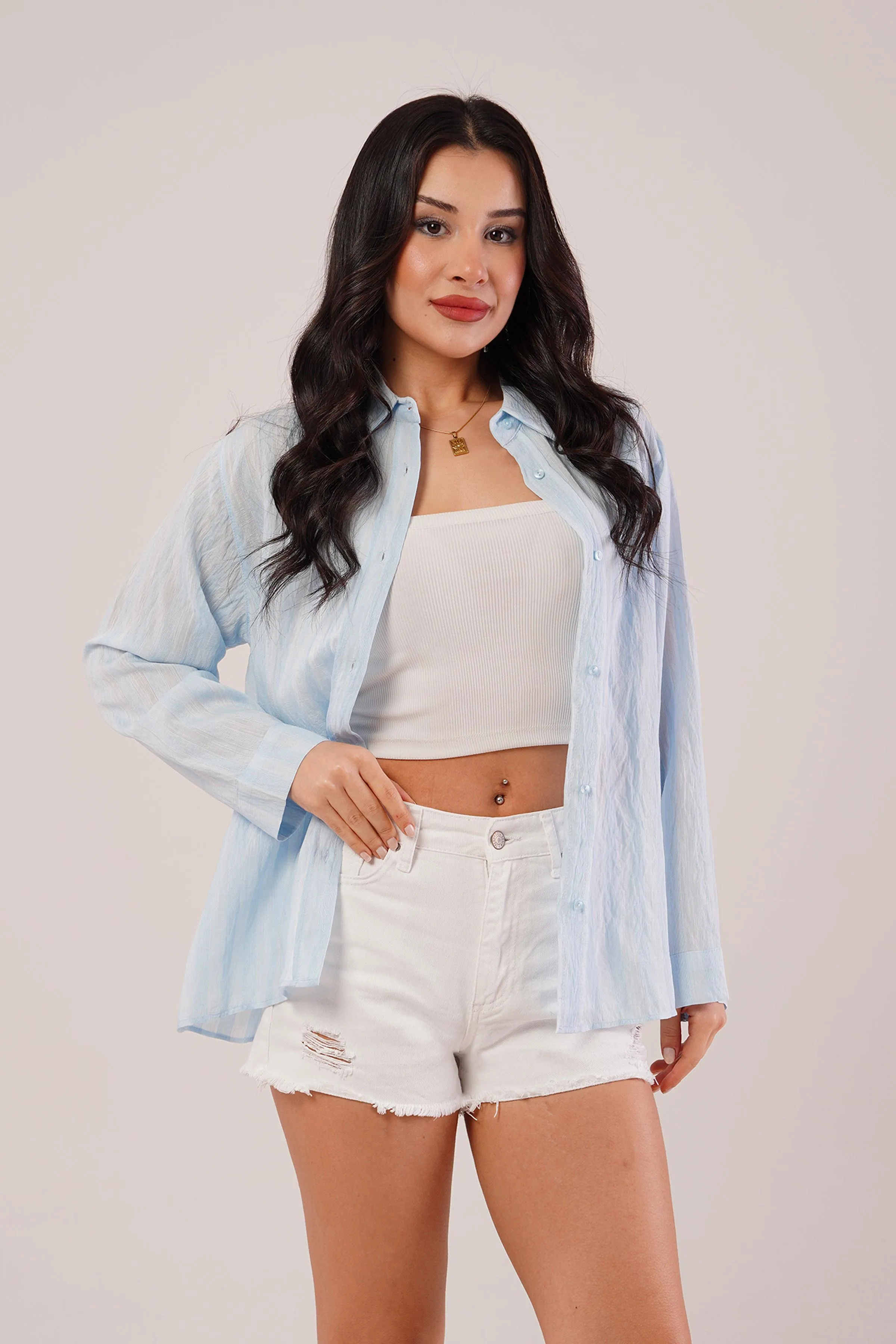 قميص نسائي ساتان مخطط بأكمام طويلة يتميز بتصميم أنيق ولمسة لامعة. مصنوع من قماش ساتان ناعم وانسيابي يمنح راحة وأناقة، مناسب للإطلالات اليومية والكاجوال الراقية.