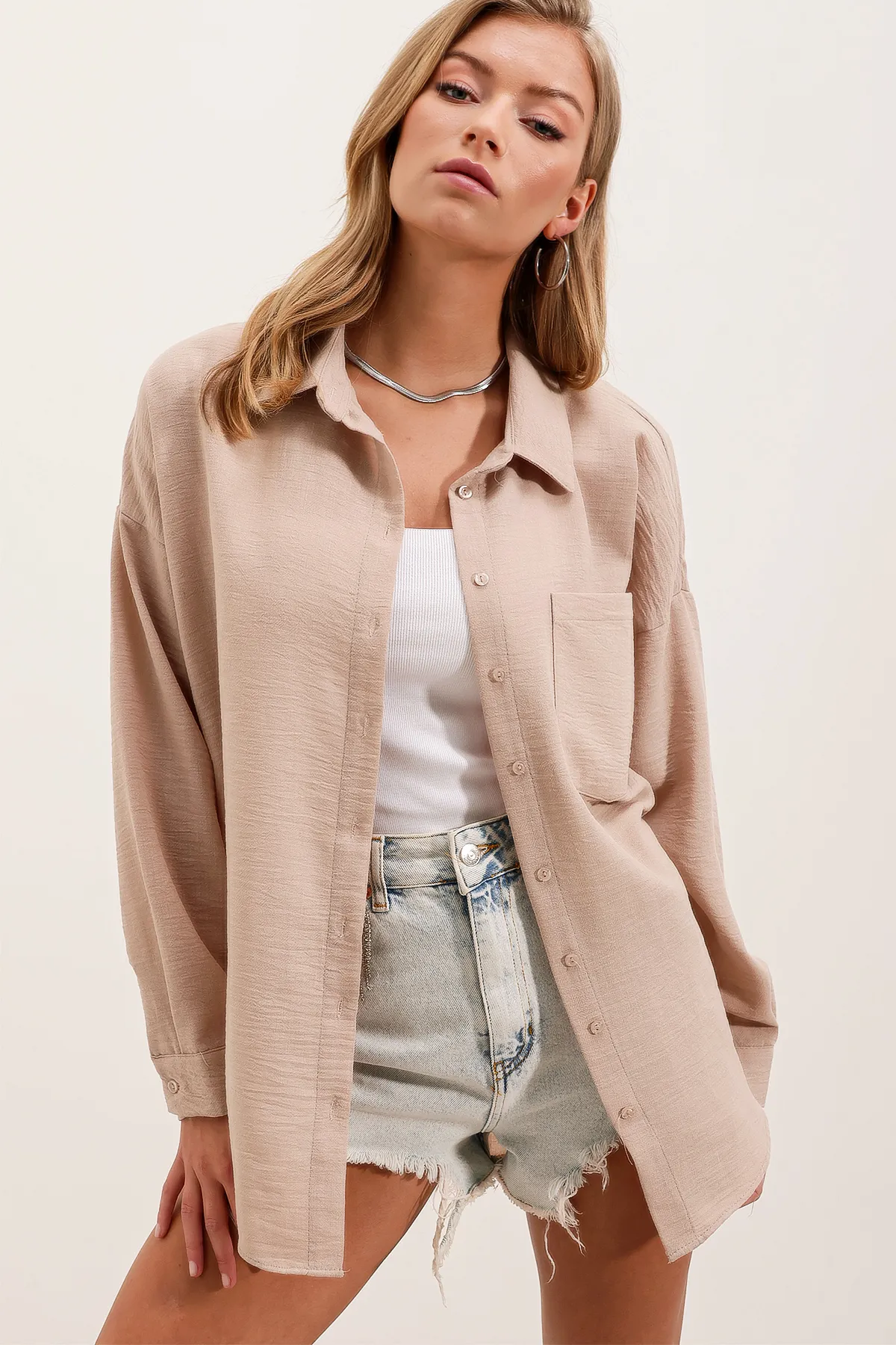 قميص مخطط مريح بأكمام طويلة وياقة كلاسيكية وإغلاق بأزرار لإطلالة صيفية يومية شيك.
