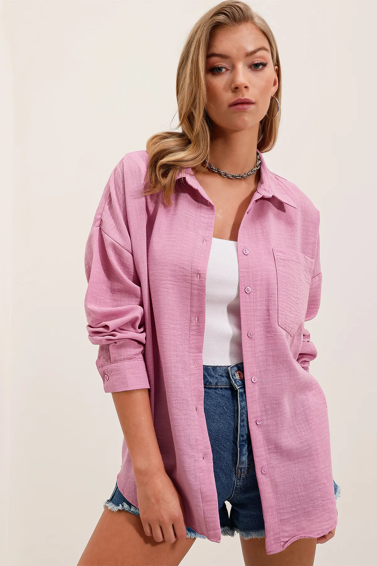 قميص نسائي بقصة واسعة ونقشة زهور ملونة تضيف حيوية وأناقة للإطلالة. يتميز بأكمام طويلة وخامة خفيفة ومريحة، مناسب للاستخدام اليومي والإطلالات الكاجوال مع لمسة عصرية ناعمة.