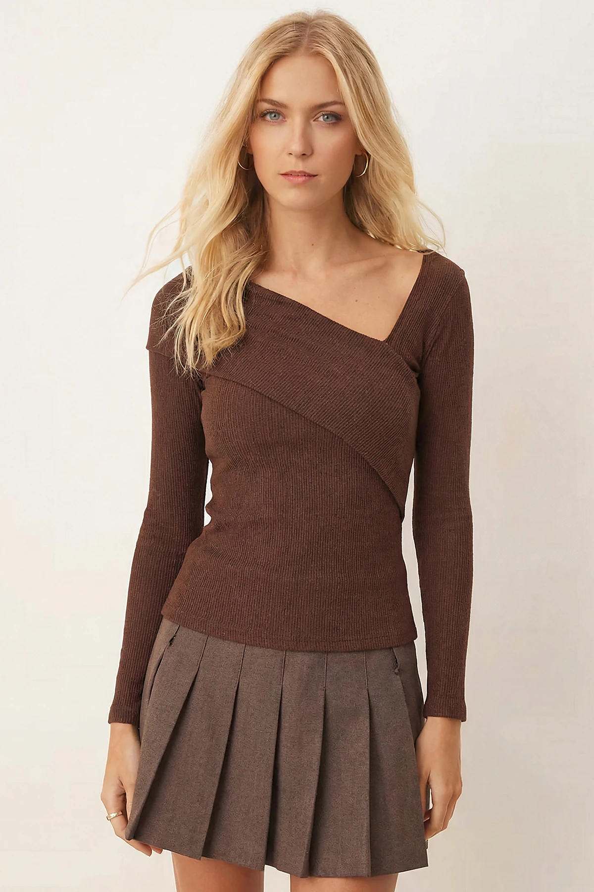بلوزة نسائية مريحة بقصة عادية وأكمام طويلة وياقة قائمة مع تفاصيل طيات ونقشة منقوشة لستايل يومي شيك وكيوت.
