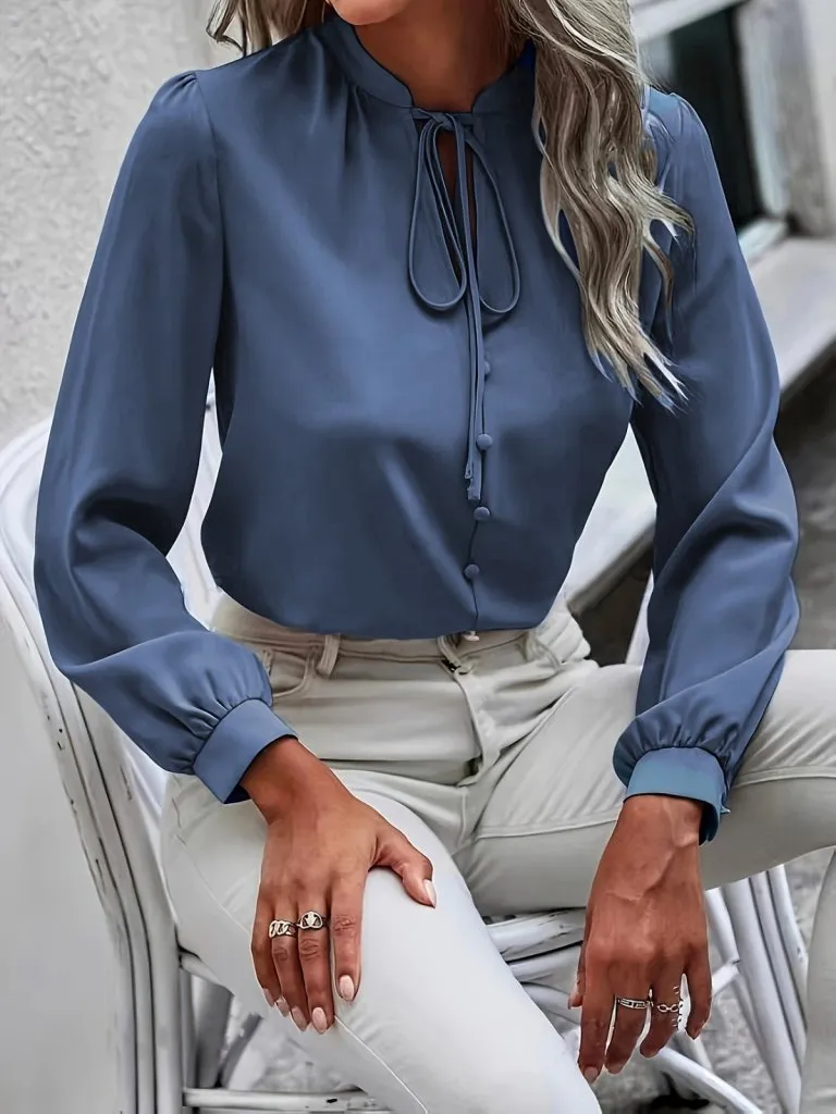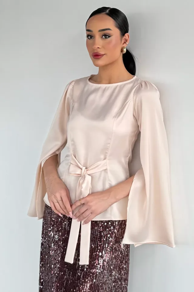 بلوزة لامعة بحمالات رفيعة وياقة متدلية ناعمة تمنح مظهرًا أنثويًا أنيقًا. مناسبة للسهرات والمناسبات الخاصة وتضفي لمسة راقية على الإطلالة.