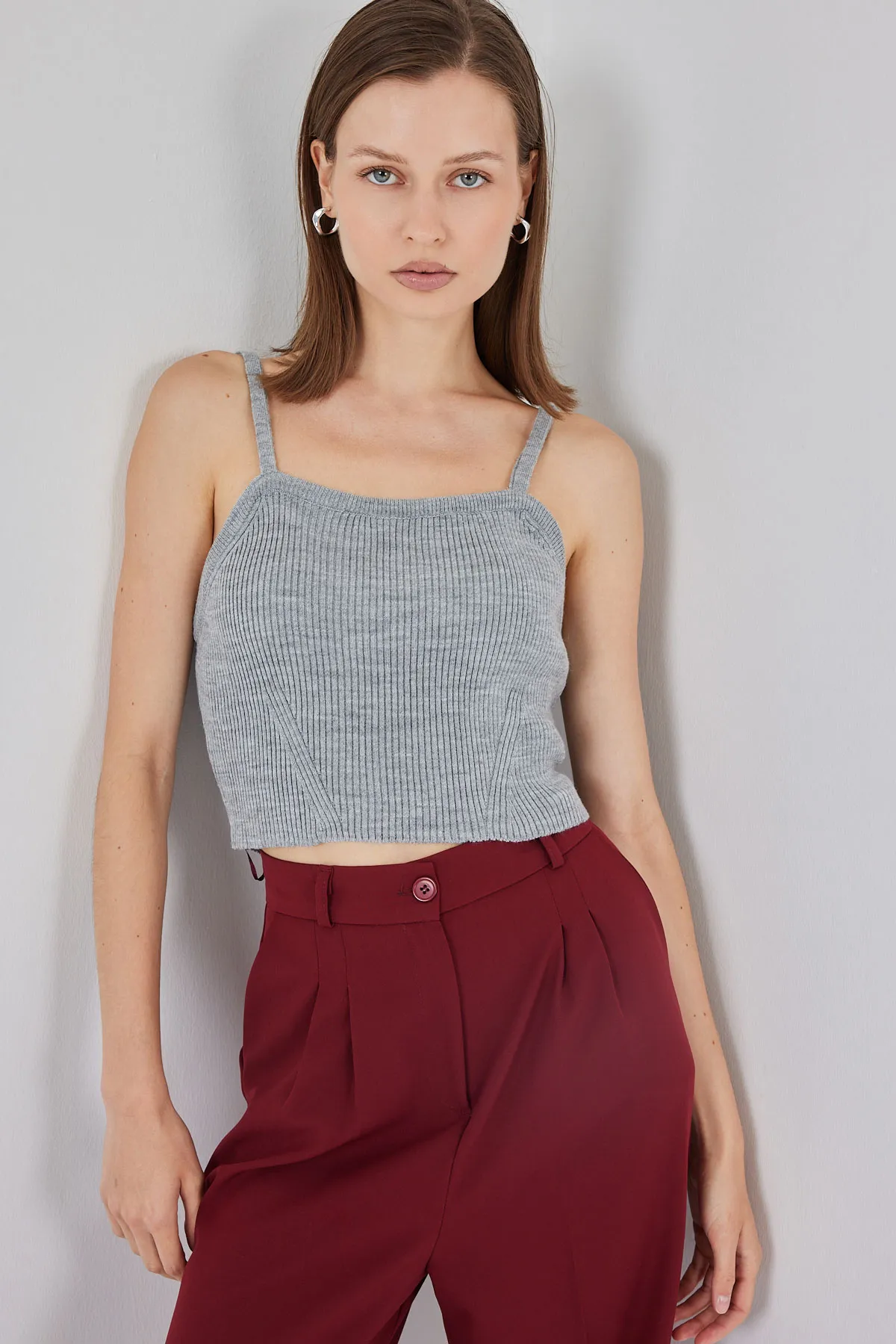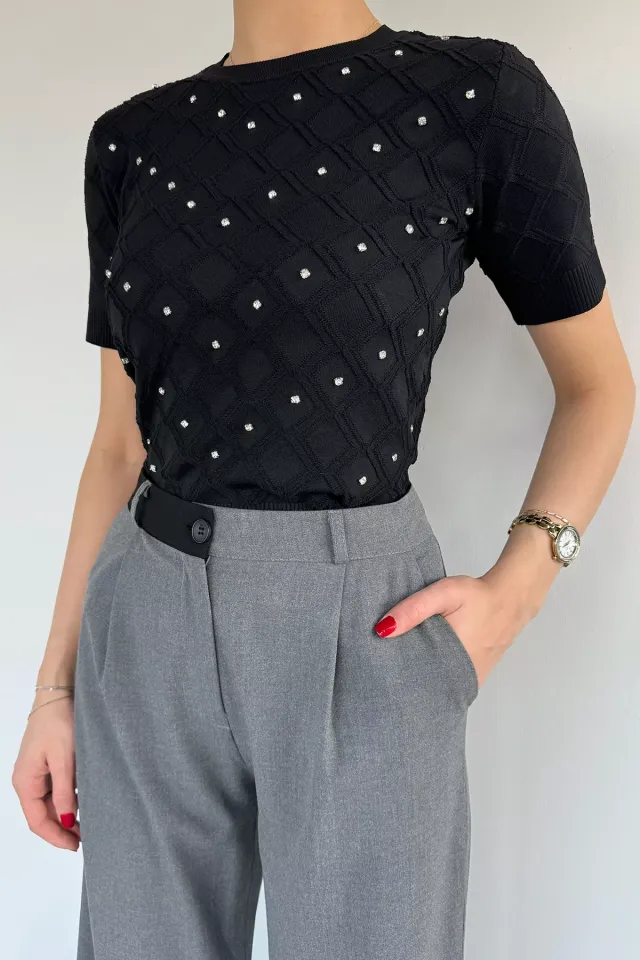 بلوزة من الكتان بياقة قائمة وتفصيلة بإكسسوار زهور لستايل يومي صيفي عصري ومريح.