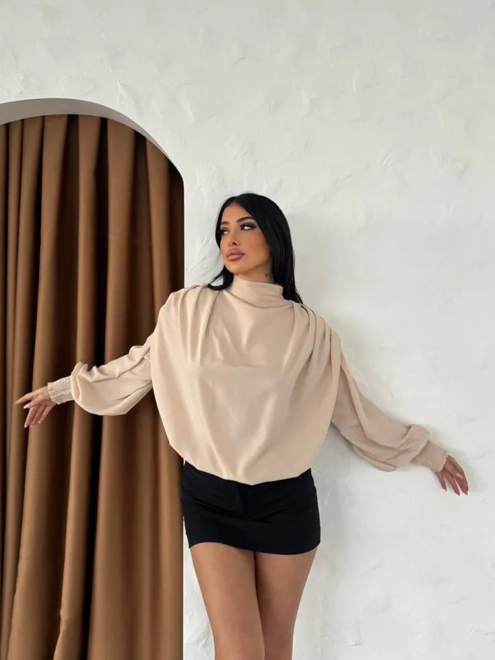 بلوزة بياقة نصف مدورة وأكمام خفاش فضفاصة للنساء