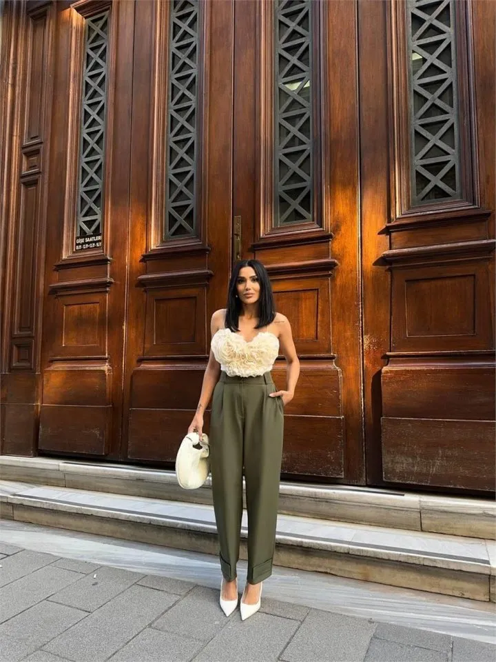 بنطلون بخصر عالي وقصة منتظمة مع تفاصيل حزام لإطلالة يومية مريحة وشيك بستايل كاجوال.