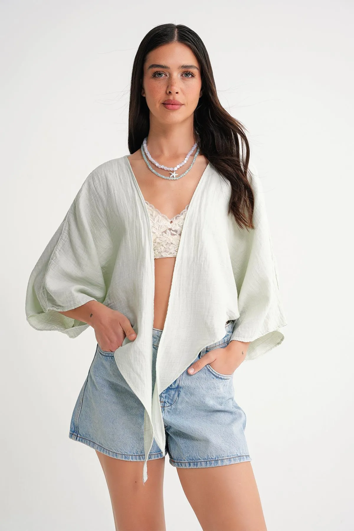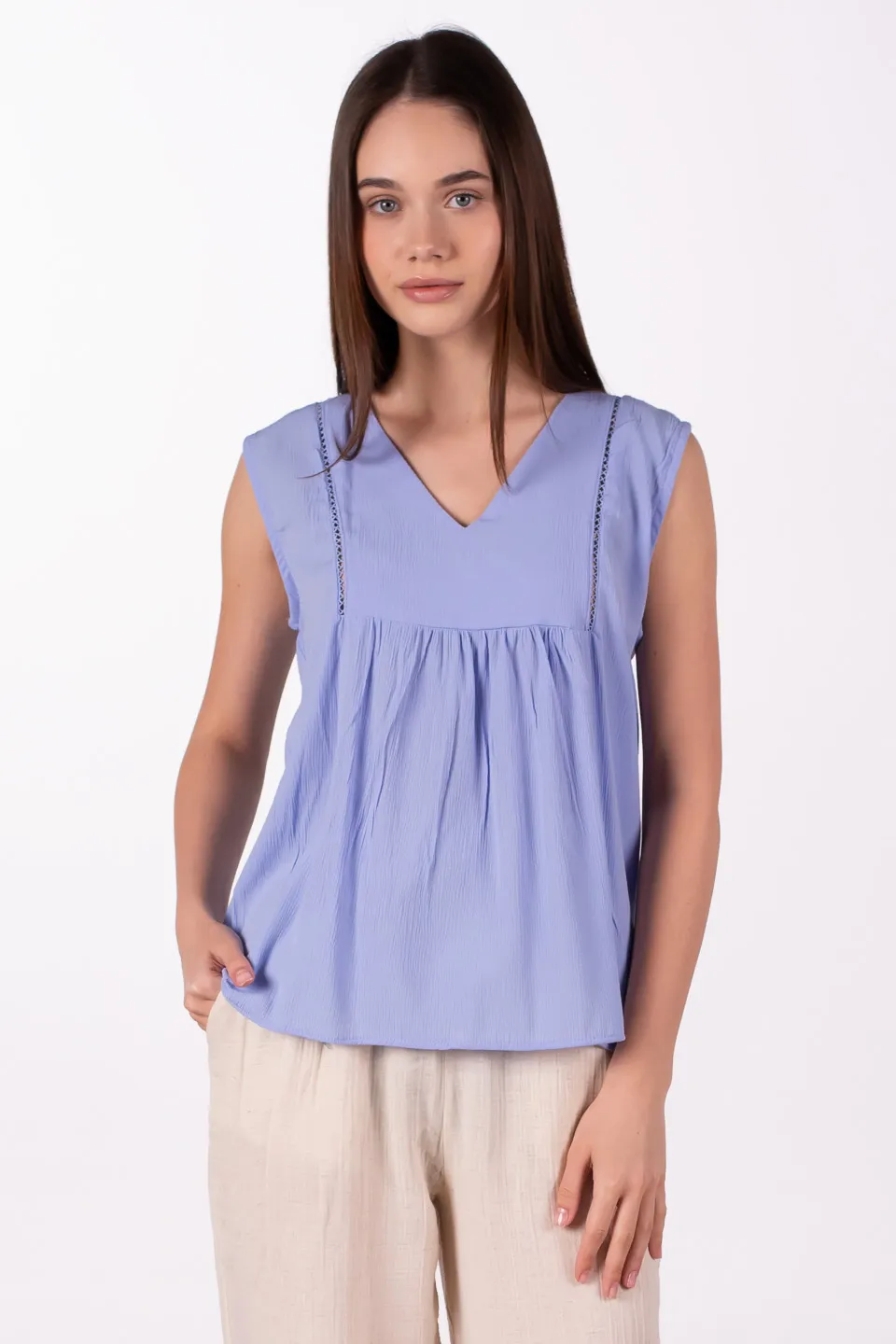 بلوزة بدون أكمام بتصميم ياقة بطيات أنيقة تضيف لمسة راقية. خفيفة ومريحة، مناسبة للارتداء اليومي أو الإطلالات الكاجوال الأنيقة.