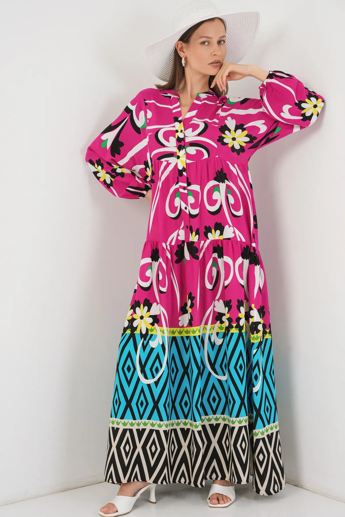 فستان نسائي طويل مناسب للاستخدام اليومي والكاجوال. يتميز بأكمام طويلة عادية وياقة دائرية، مع قصة A-line بطيات تمنح راحة وشكلًا أنيقًا. تفصيلة الحزام تضيف تحديدًا للخصر ولمسة مرتبة، مناسب لفصل الصيف.