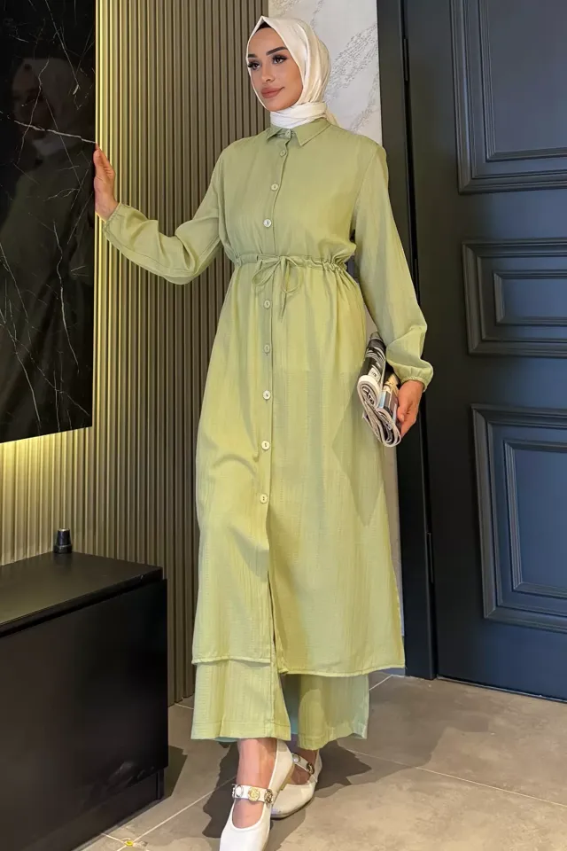 طقم تونيك وبنطال نسائي أنيق مناسب للاستخدام الكاجوال. يتميز التونيك بياقة دائرية وأكمام طويلة بقصة جرس مع قَصّة منتظمة مريحة، ويأتي مع بنطال طويل لإطلالة متناسقة. تضيف التفاصيل الحجرية لمسة أنيقة ناعمة، مناسب لفصل الصيف.