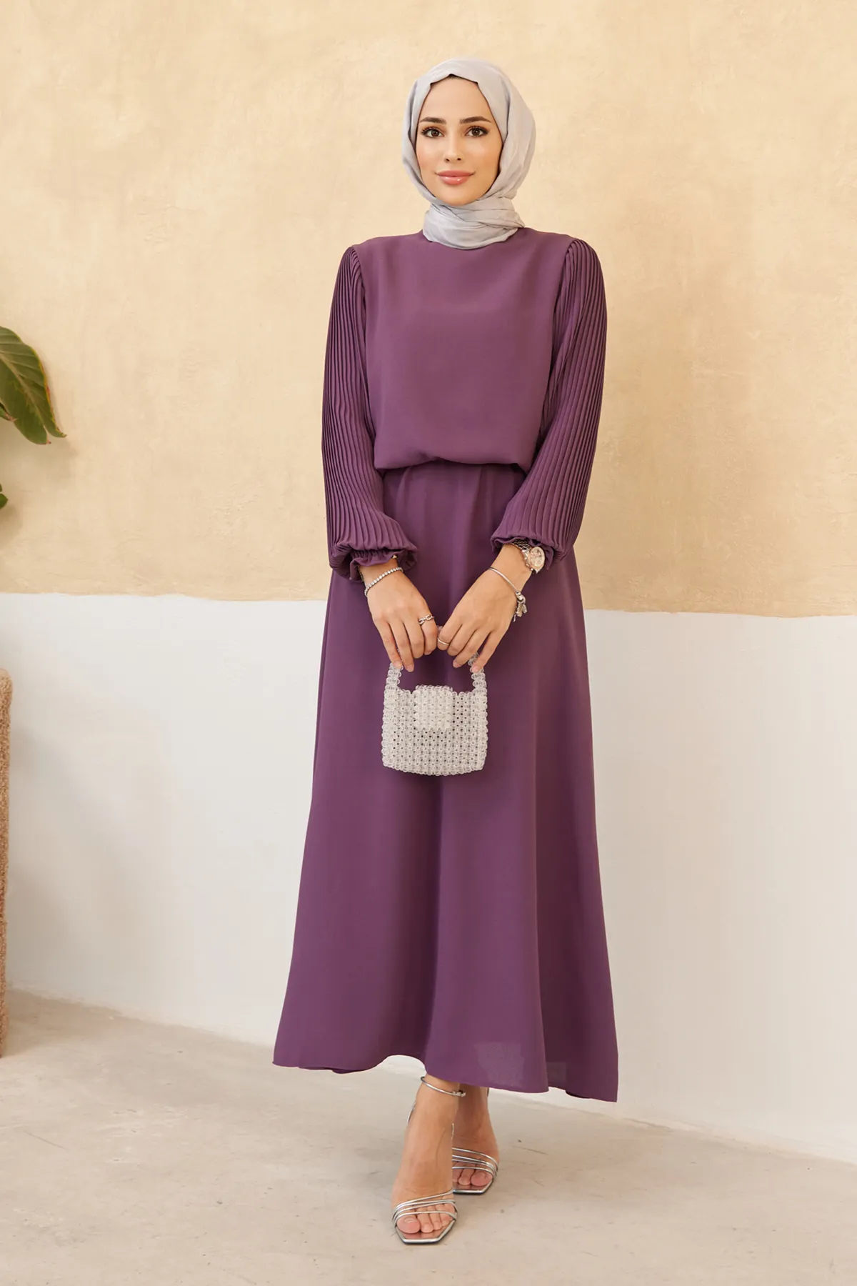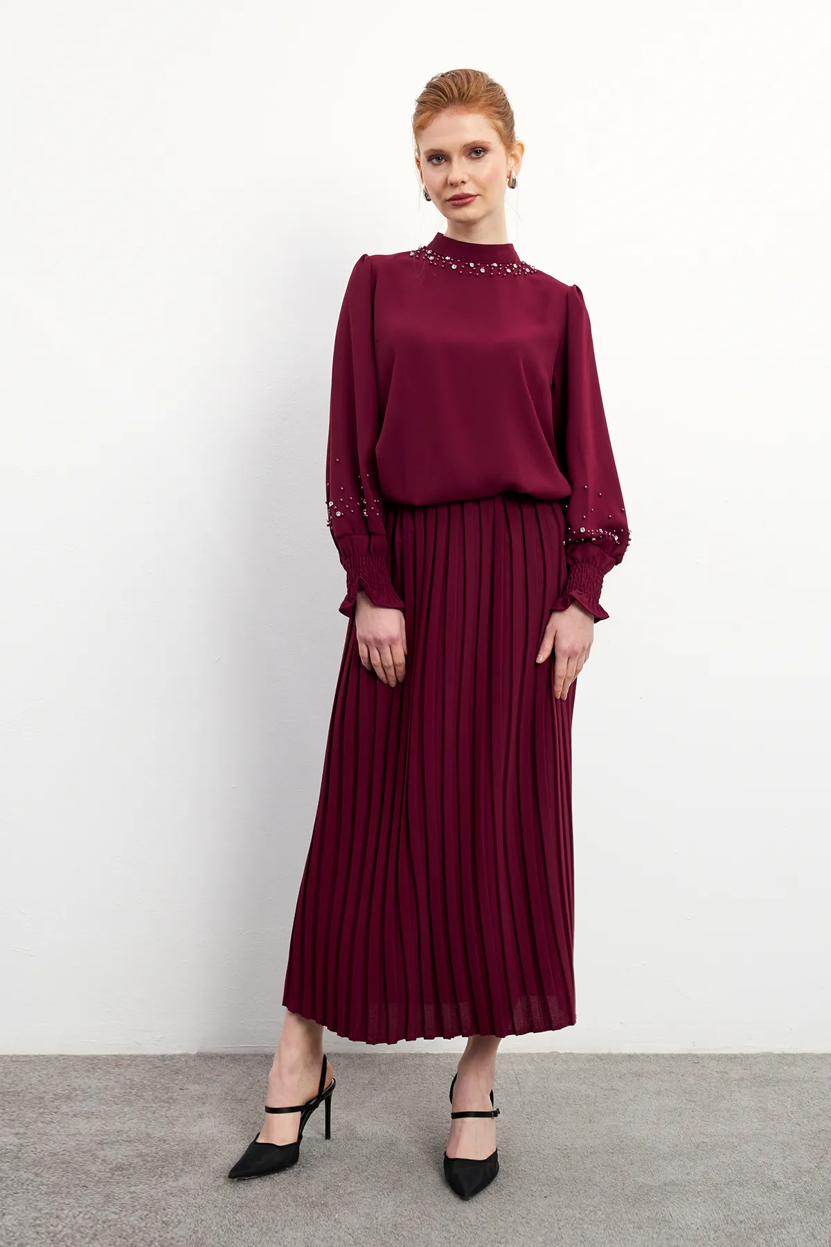 طقم نسائي أنيق مناسب للاستخدام اليومي والكاجوال. يتميز بياقة دائرية وأكمام بالون طويلة مع تفاصيل طيات، وقصة A-line طويلة تمنح راحة وقَصّة منتظمة. الخصر المطاطي مع رباط شد يوفر إمكانية تعديل، وتضيف التطريزات الحجرية لمسة أنيقة ناعمة، مناسب لفصل الصيف.