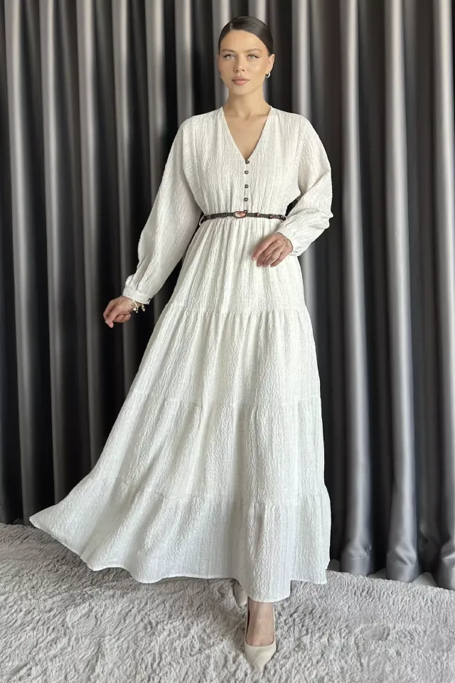الموديل ترتدي مقاس S – الطول 172 سم، الوزن 53 كغ، الصدر 83 سم، الخصر 70 سم، الورك 91 سم