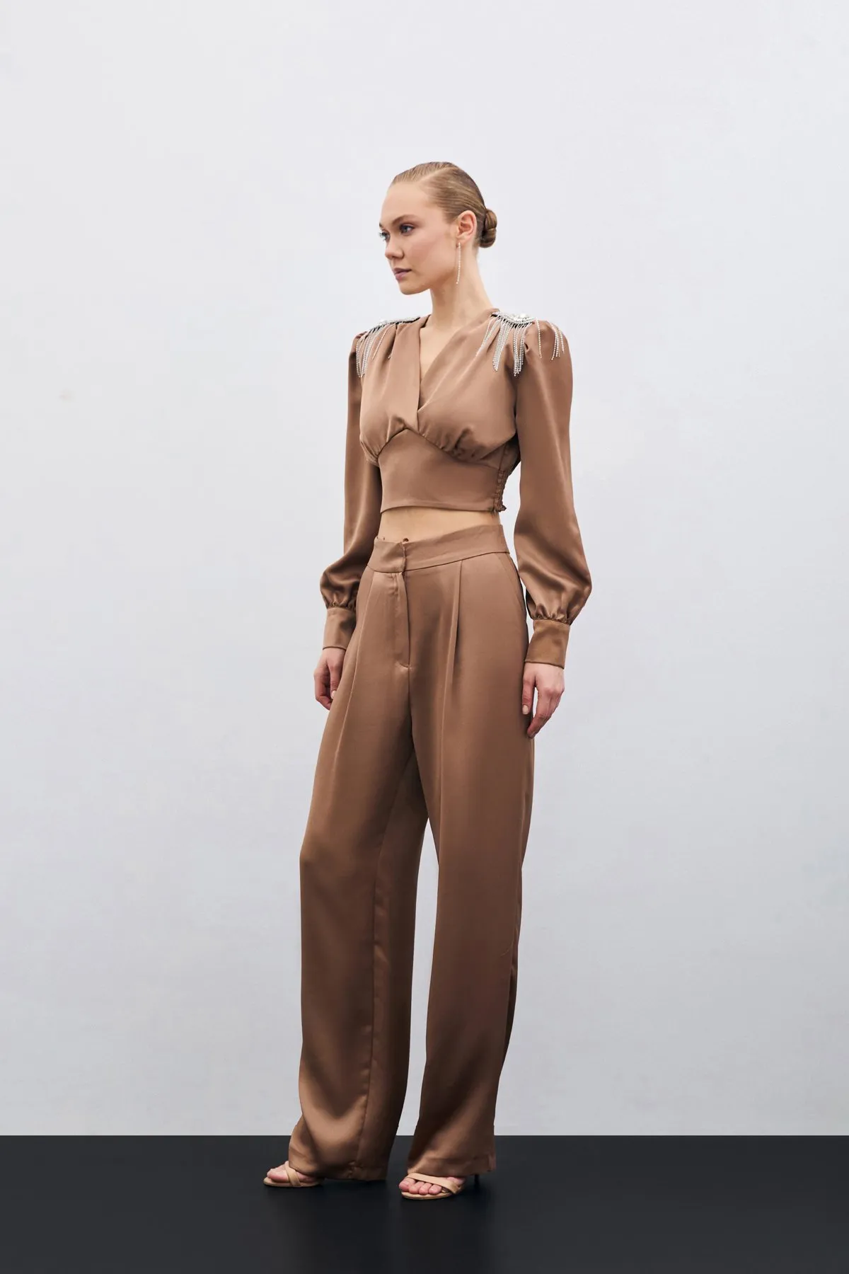 بنطال مريح بخصر عالي وقصة ساق واسعة بترتر لامع وقماش شفاف مع شورت داخلي لإطلالات سهرة أنيقة وحفلات.