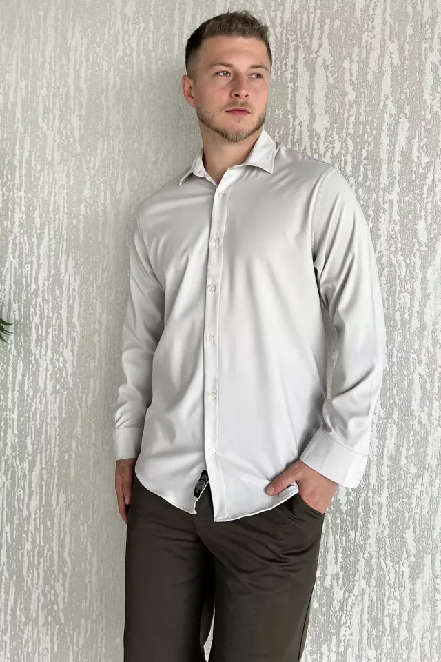 قميص رجالي بأكمام طويلة وقصة مريحة، بياقة كلاسيكية وأزرار أمامية. مصنوع من 97% بوليستر و3% ليكرا، مما يوفر مرونة خفيفة ومظهرًا أنيقًا ومتناسقًا.
