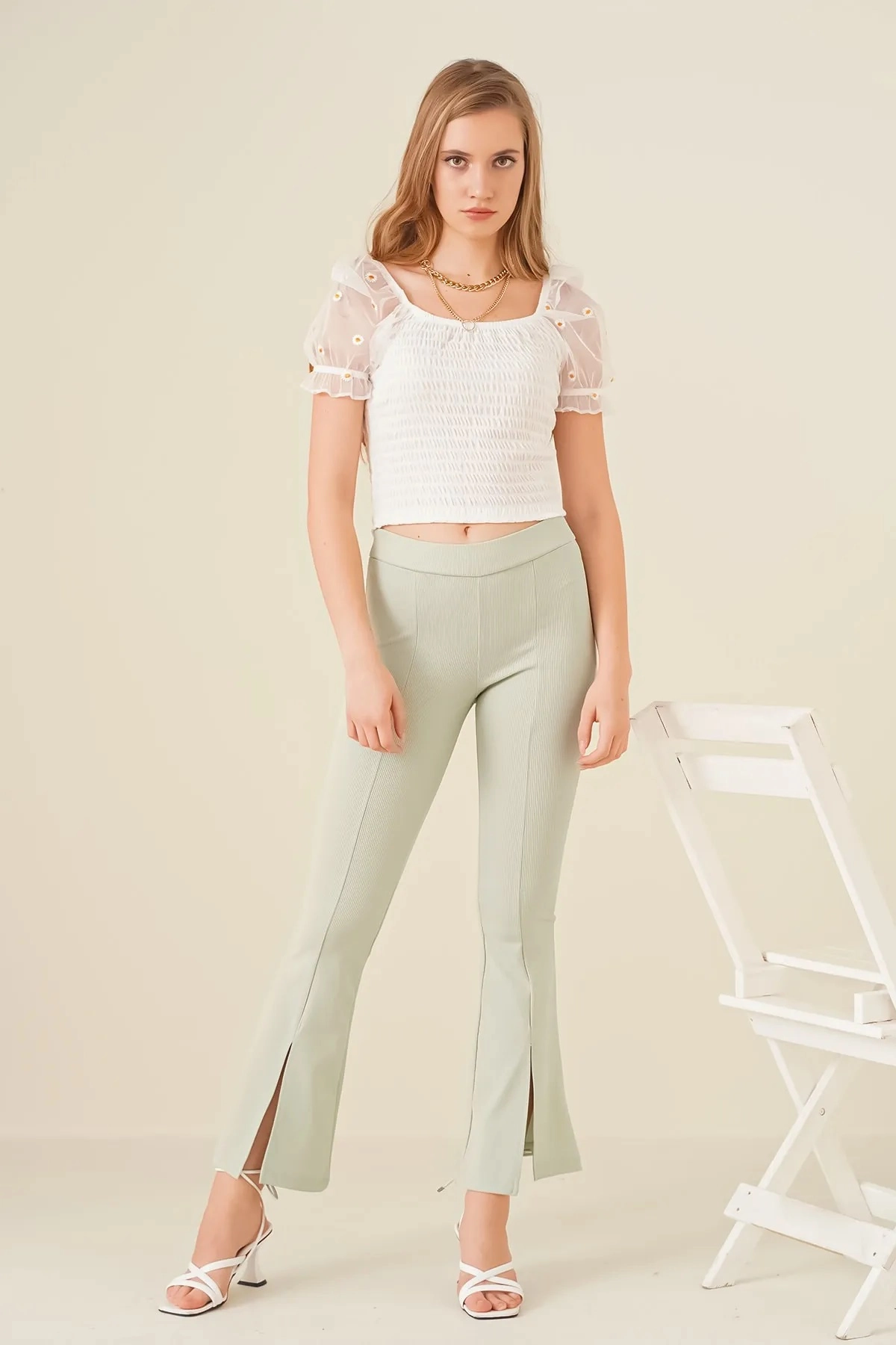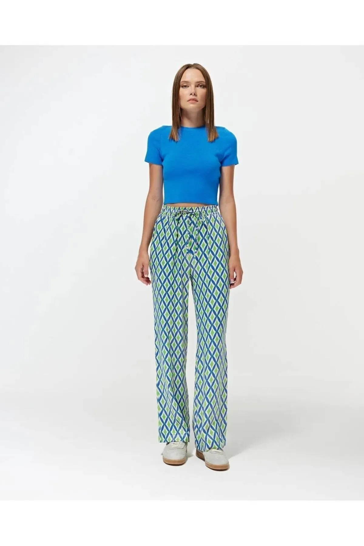 بنطال مريح بخصر عالي وقصة ساق واسعة بنقشة منقوشة لستايل يومي شيك لصيف وربيع سهل التنسيق.