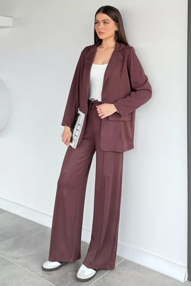 طقم تريكو مريح من قطعتين ببلوزة بياقة عالية وقصة مريحة مع بنطال بخصر عالي يمنحك ستايل يومي شتوي عملي.