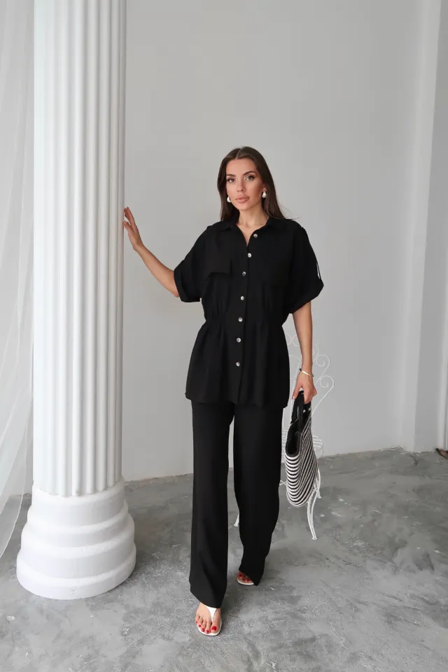 طقم تونيك محتشم مريح بسحاب نصفي وتفاصيل مغايرة مع بنطلون بخصر مرن لستايل يومي عملي ولمسة عصرية.