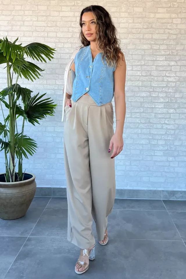 بنطال بالازو نسائي بخصر عالي ونمط مخطط وقصة ساق واسعة بحافة بأزرار - Beyond Store