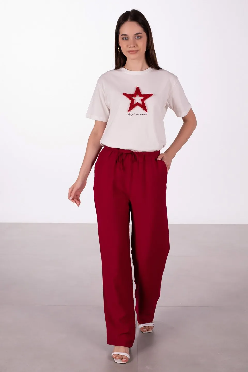 بنطال بالازو نسائي بخصر عالي وقصة ساق واسعة بنمط مخطط وإغلاق بأزرار لإطلالة رسمية شيك لمواسم الانتقال.