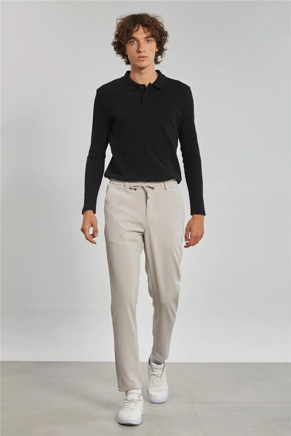 بنطال رياضي رجالي سادة بخصر مطاطي ورباط، مصنوع من 80% قطن، 15% إيلاستين، و5% ليكرا. مصمم للارتداء اليومي براحة ومرونة ومظهر أنيق.