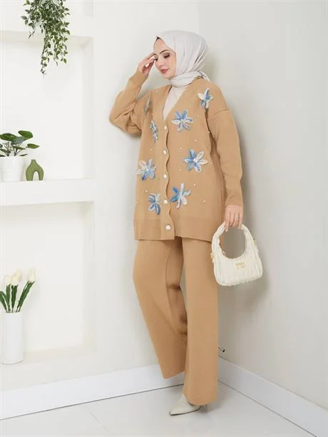 طقم نسائي محبوك محتشم من قطعتين مع كارديغان بتفاصيل أزرار وتنورة طويلة بخصر عالي وقصة A-line لستايل يومي مريح وسهل.