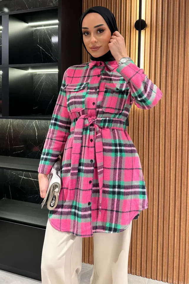 تونيك نسائي محبوك محتشم بتفاصيل وبر ناعم ونقشة خطوط بارزة مع قصة محددة لراحة يومية وستايل شتوي أنيق.