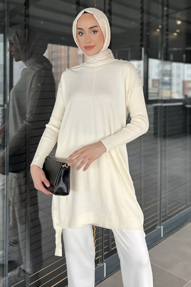 تونيك نسائي محبوك بتفاصيل وبر ناعم ونقشة خطوط وياقة عالية - Beyond Store