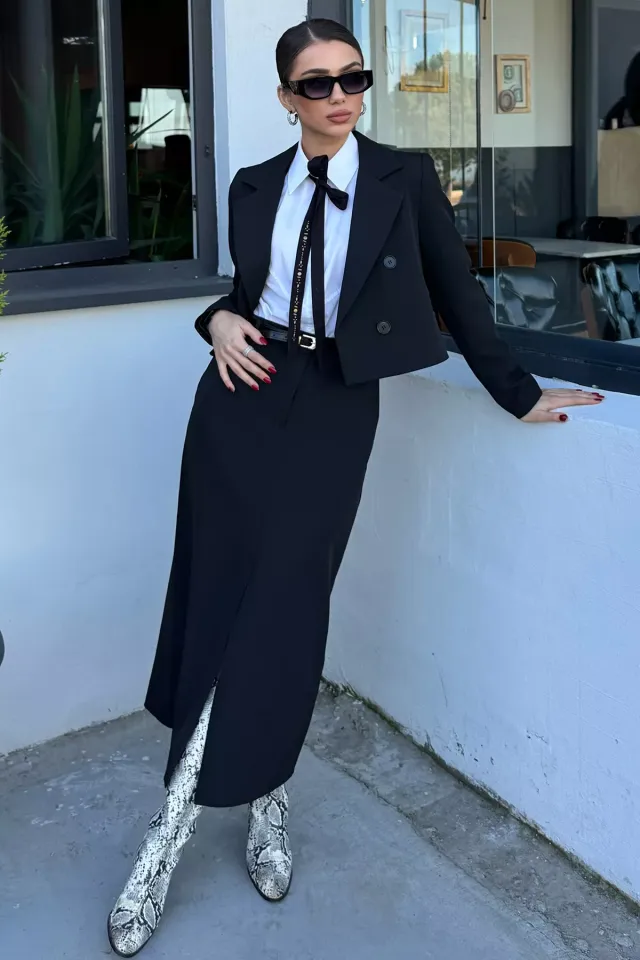 بليزر مخطط مريح بياقة كلاسيكية وقصة مرتبة لستايل يومي شيك وسهل التنسيق طوال الموسم.