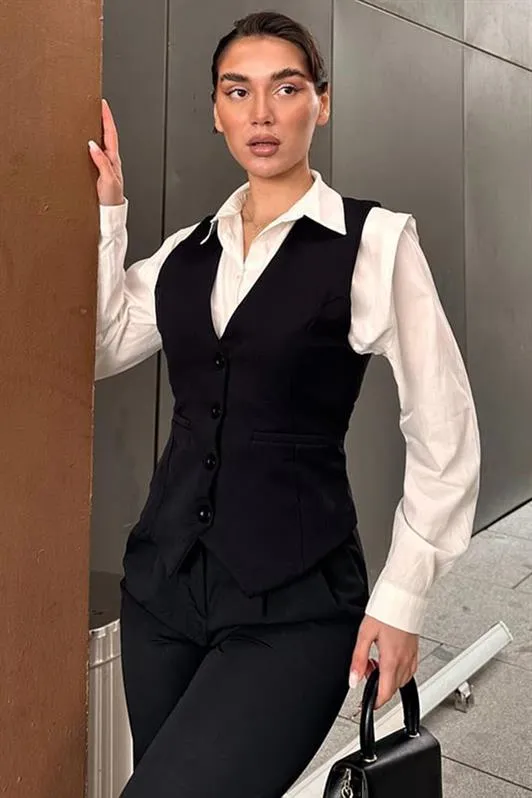فيست بدون أكمام مريح بياقة V وإغلاق بأزرار مع جيوب فليتو عملية لستايل يومي شيك وسهل التنسيق.