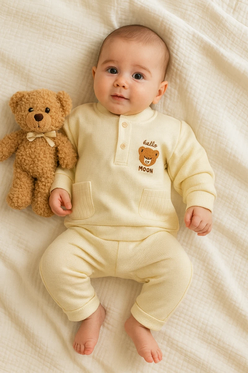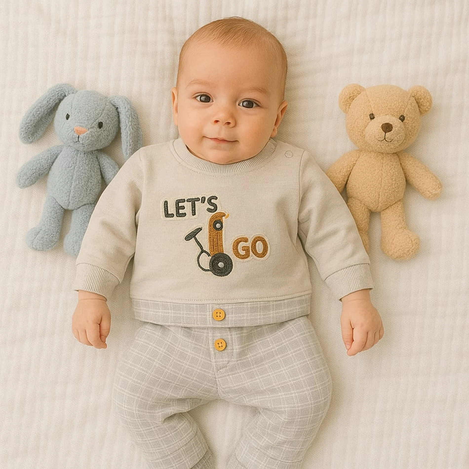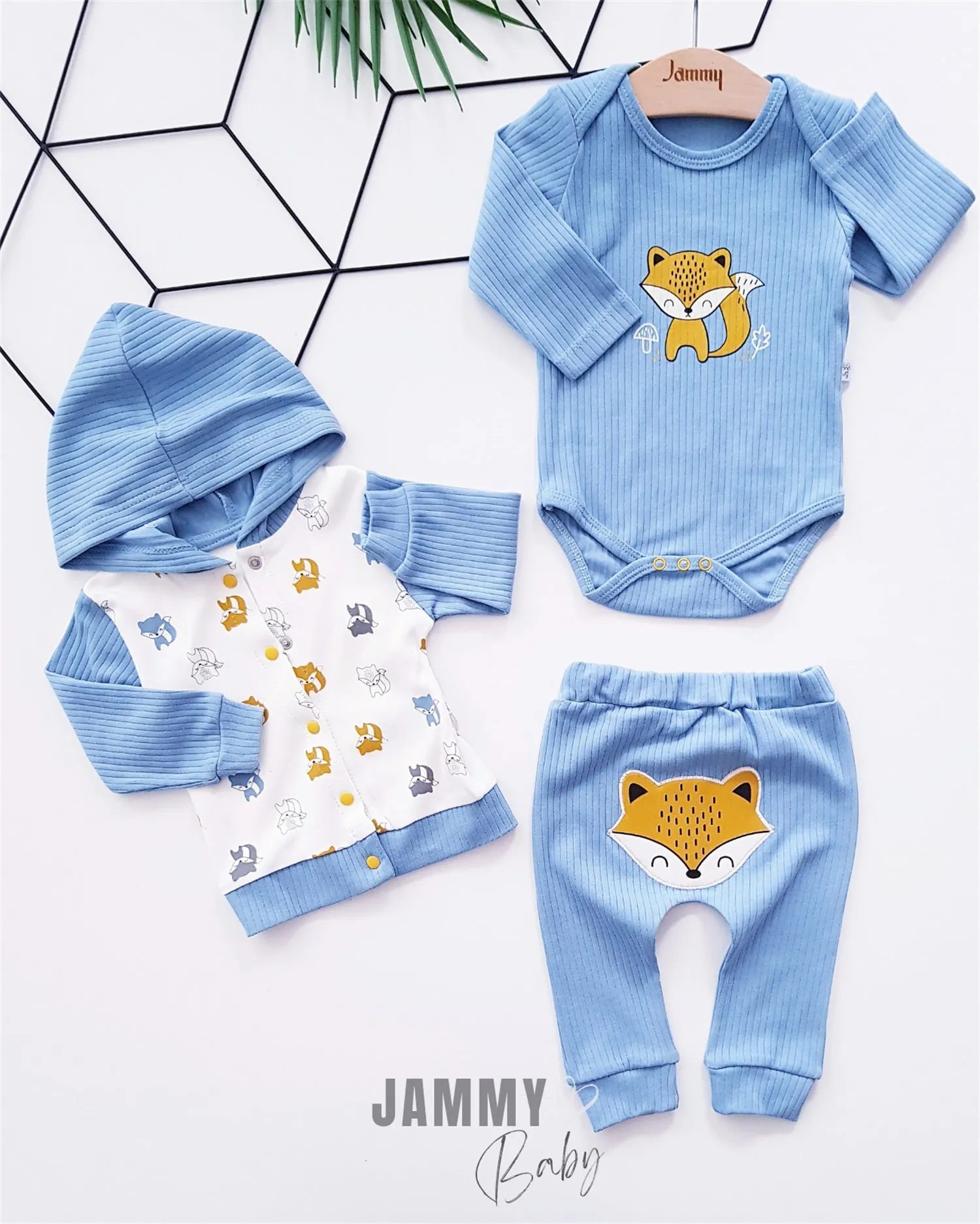 طقم ولادي مكون من 3 قطع مزين بطبعات جذابة وأزرار كبس أمامية لتسهيل اللبس. يشمل بلوزة وبنطلون وسترة عملية. مصنوع من قماش ناعم ولطيف على بشرة الطفل، يوفر الراحة وسهولة الحركة للاستخدام اليومي.