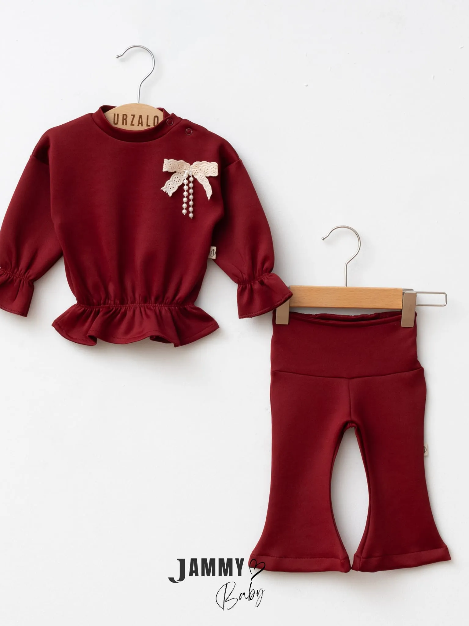 طقم بناتي للرضع مزين بطبعة قلوب مع أكمام طويلة وتفاصيل كشكشة على الجزء السفلي. مصنوع من قماش ناعم ومسامي يمنح راحة عالية وحرية حركة مع إطلالة لطيفة للاستخدام اليومي.