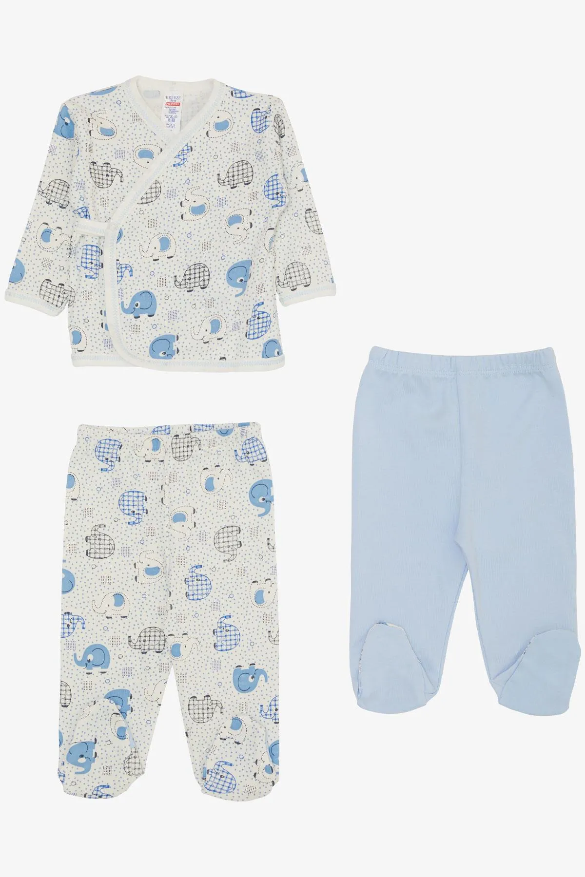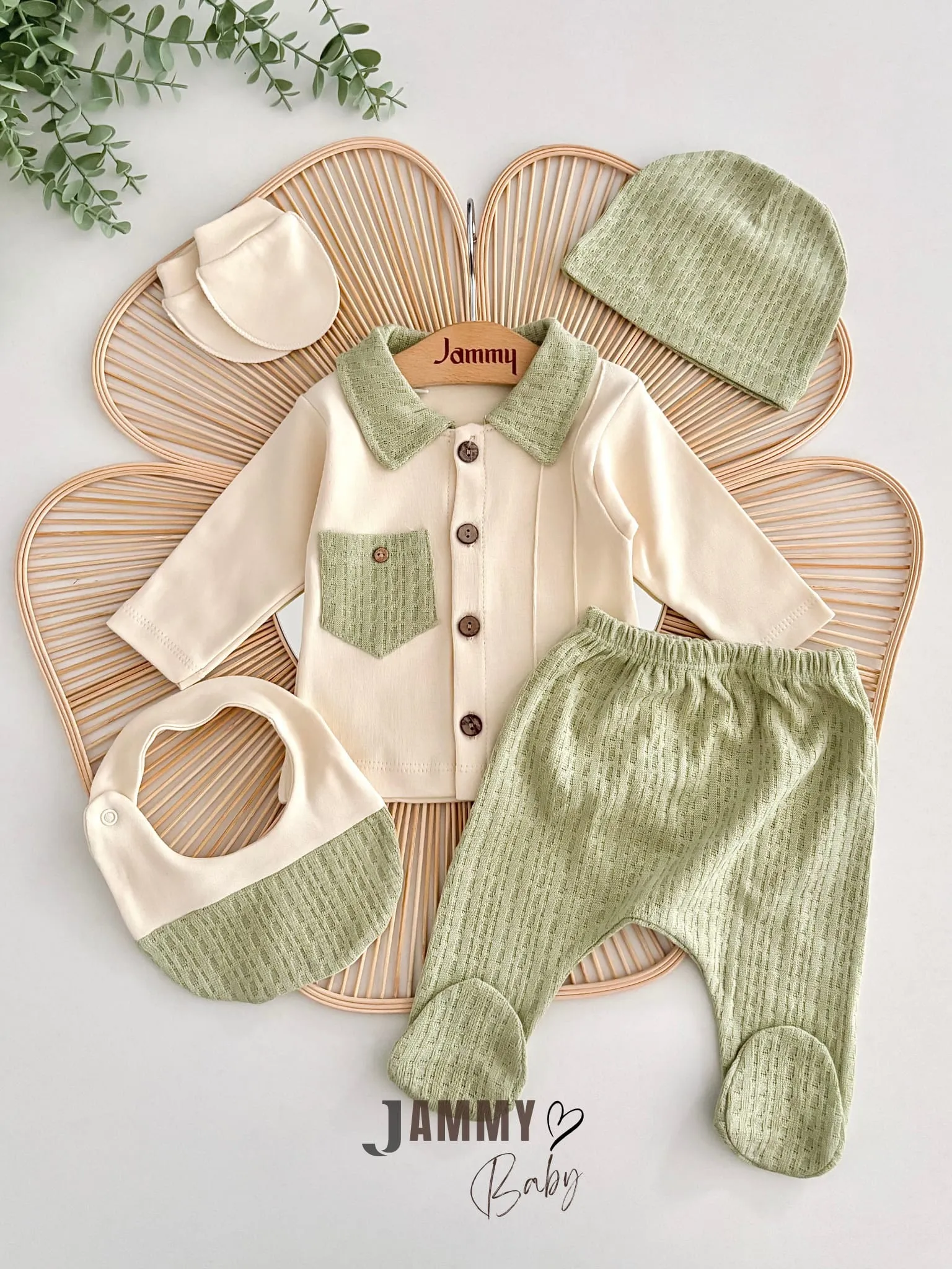 طقم خروج من المستشفى مكون من 5 قطع بتصميم فيل لطيف مع تطريز ناعم، يمنح المولود راحة مثالية منذ اللحظات الأولى. مصنوع من قماش لطيف ومسامِي مناسب للاستخدام الموسمي.