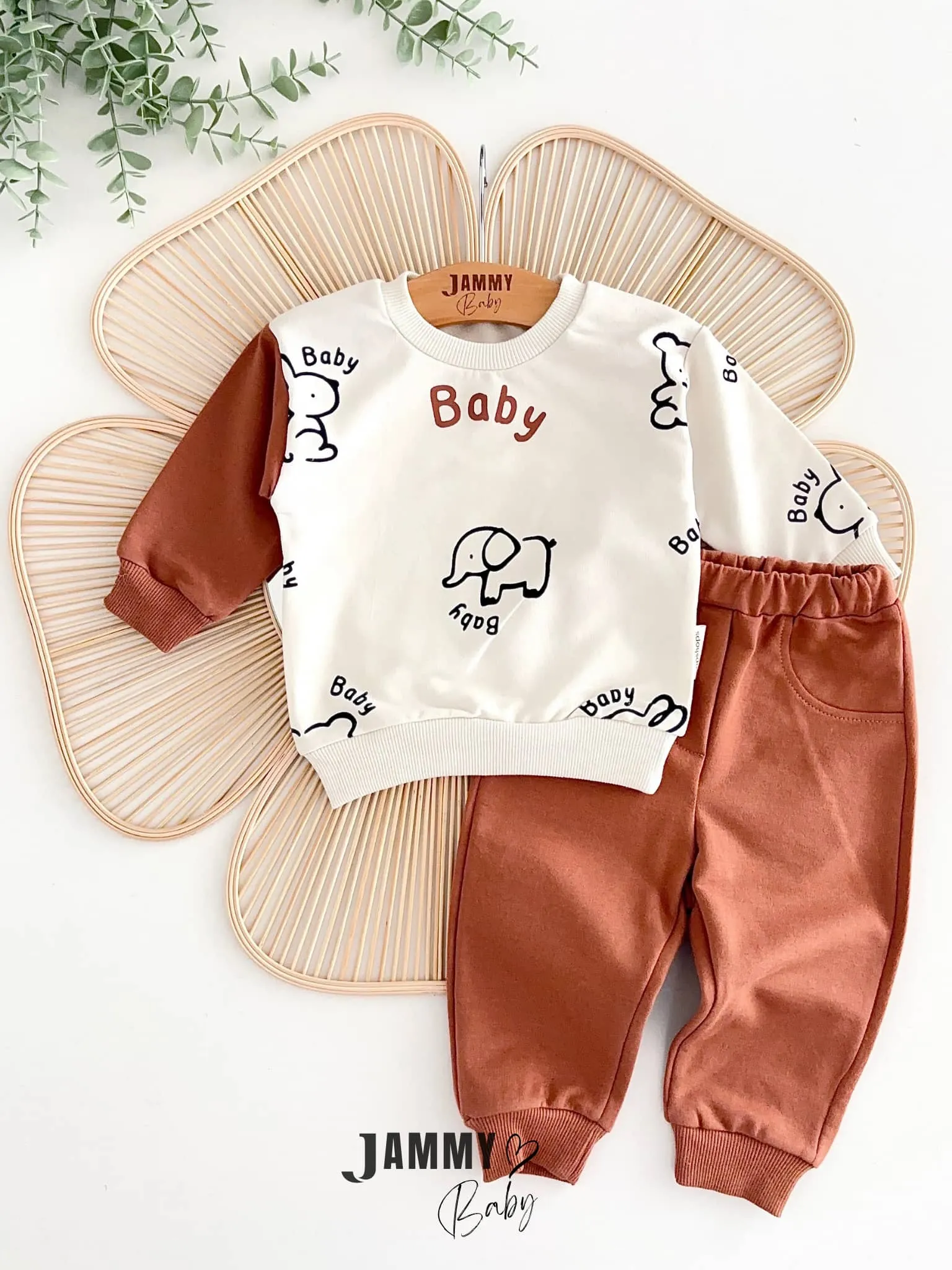 طقم ولادي رياضي مريح مزين بتطريز فيل لطيف على بلوزة بأكمام طويلة وبنطلون عملي. مصنوع من قماش ناعم ولطيف على بشرة الطفل، يوفر الراحة وحرية الحركة للاستخدام اليومي والمناسبات الخفيفة.