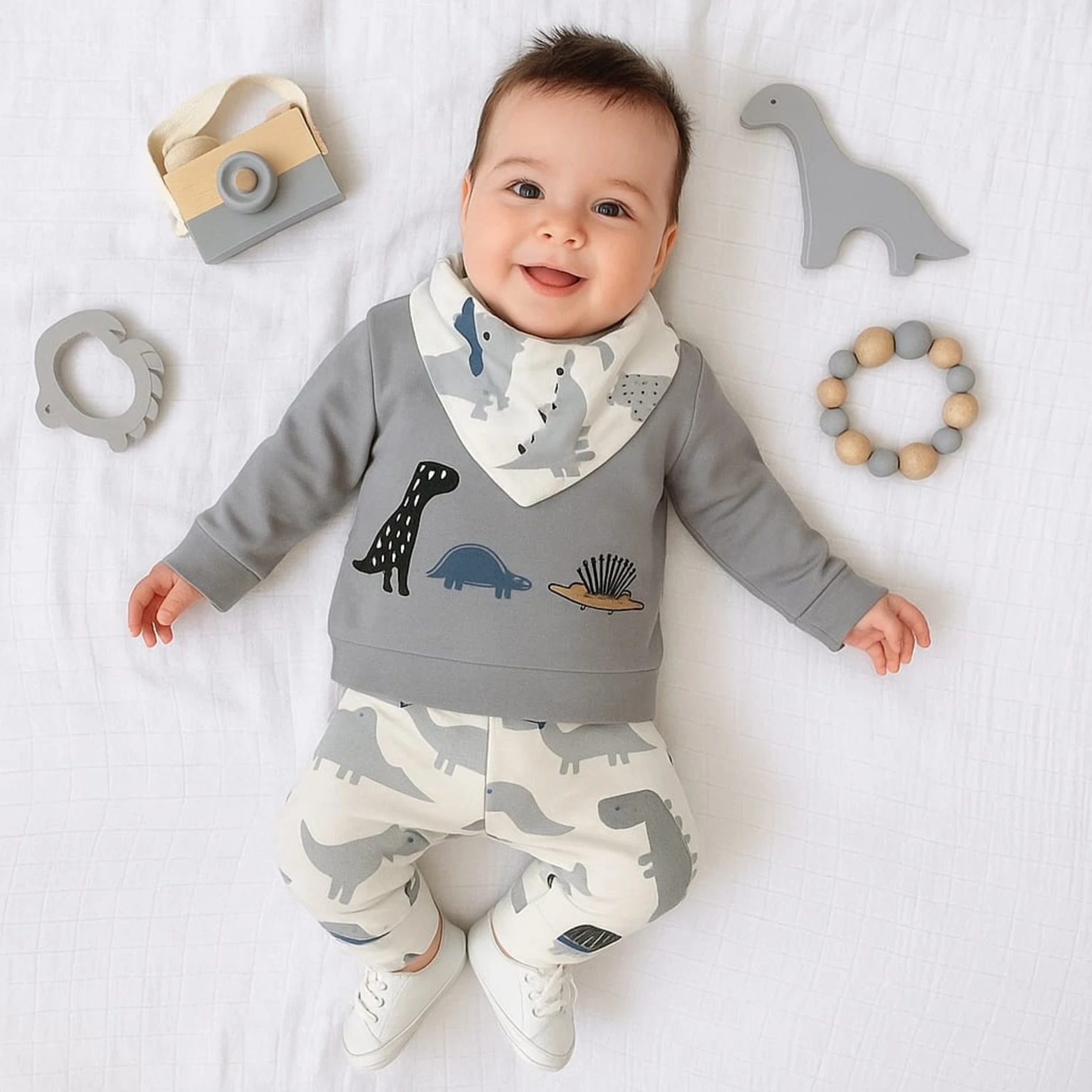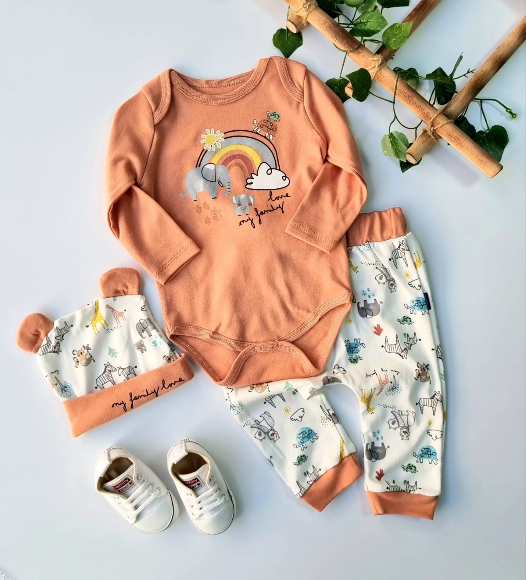 طقم ولادي مكون من بودي سوت بأكمام طويلة وبنطلون عملي مزين بطبعة زرافة لطيفة تضيف لمسة مرحة. مصنوع من قماش ناعم ولطيف على بشرة الطفل، يوفر الراحة وسهولة الحركة، مثالي للاستخدام اليومي والمشاوير الخفيفة.