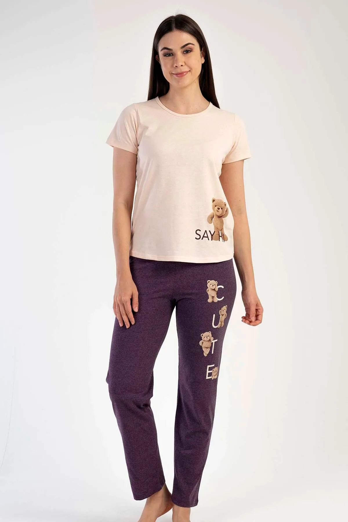 طقم بيجاما نسائي مطبوع بياقة دائرية وأكمام طويلة - Beyond Store
