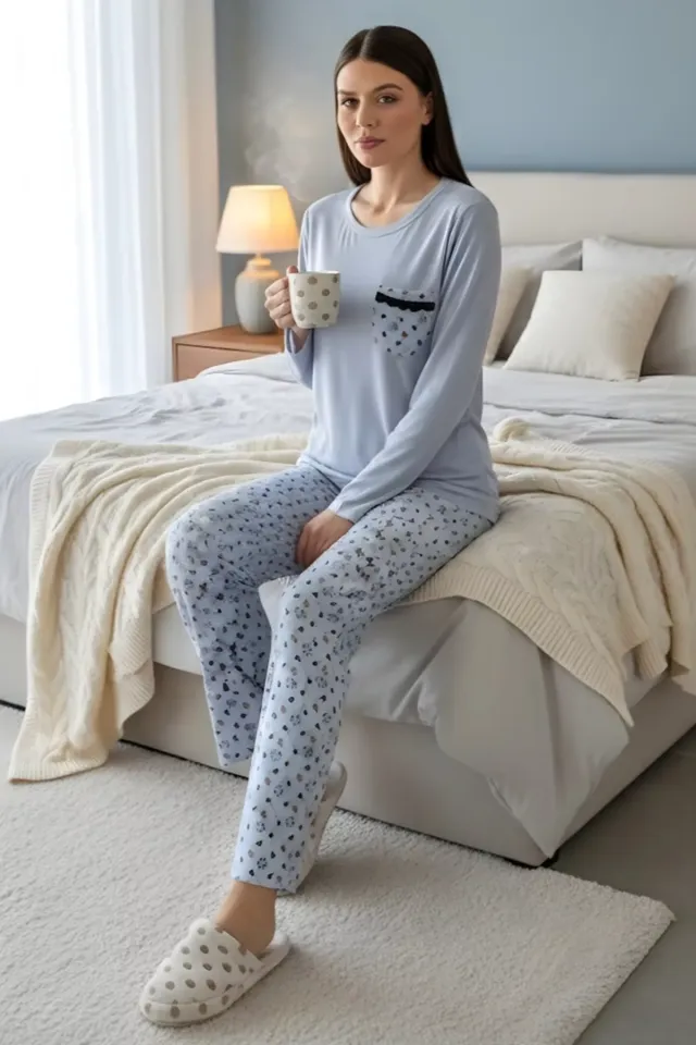 طقم بيجاما نسائي بأكمام طويلة مع قبعة وخصر مرن وتفاصيل جيوب مزدوجة مناسب للاستخدام اليومي ولوك نوم عملي.