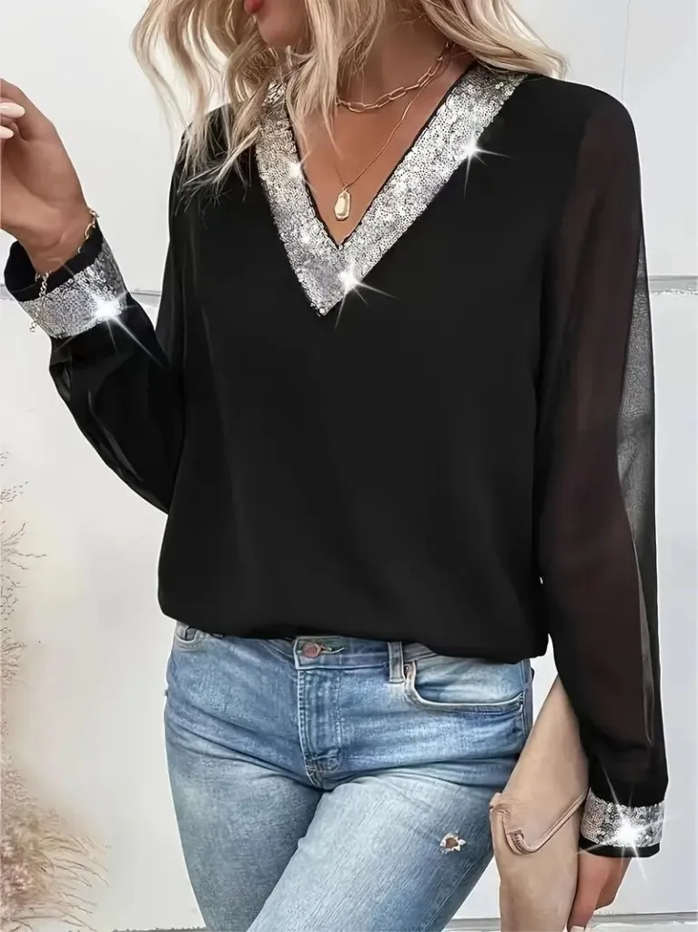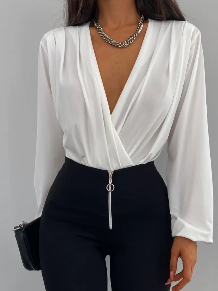 بلوزة مريحة بطيات مع خصر مرن وتفاصيل مجمعة وتفصيل توكا ذهبية لاطلالة يومية انيقة وستايل عصري.
