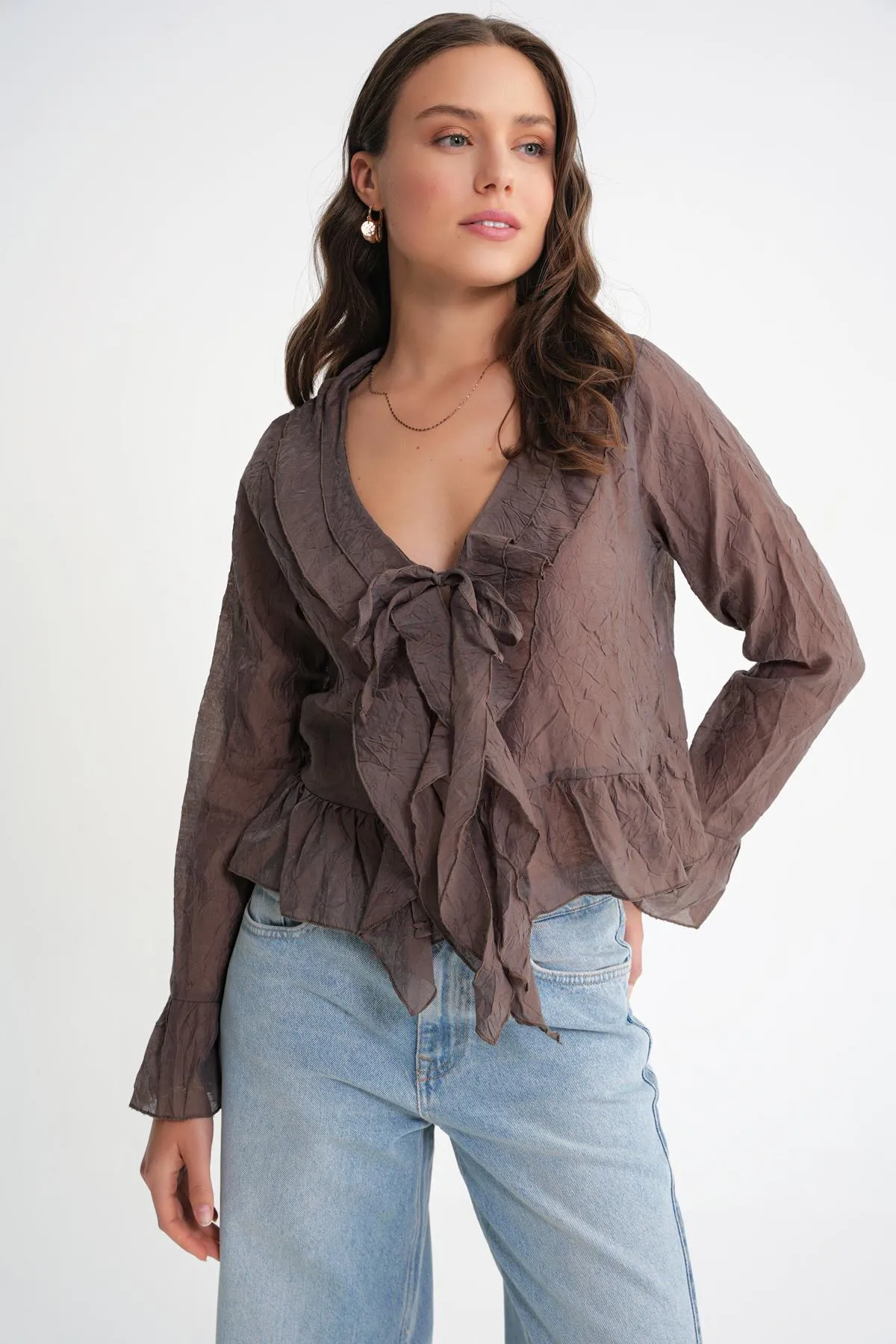 بلوزة مريحة بطيات مع خصر مرن وتفاصيل مجمعة وتفصيل توكا ذهبية لاطلالة يومية انيقة وستايل عصري.