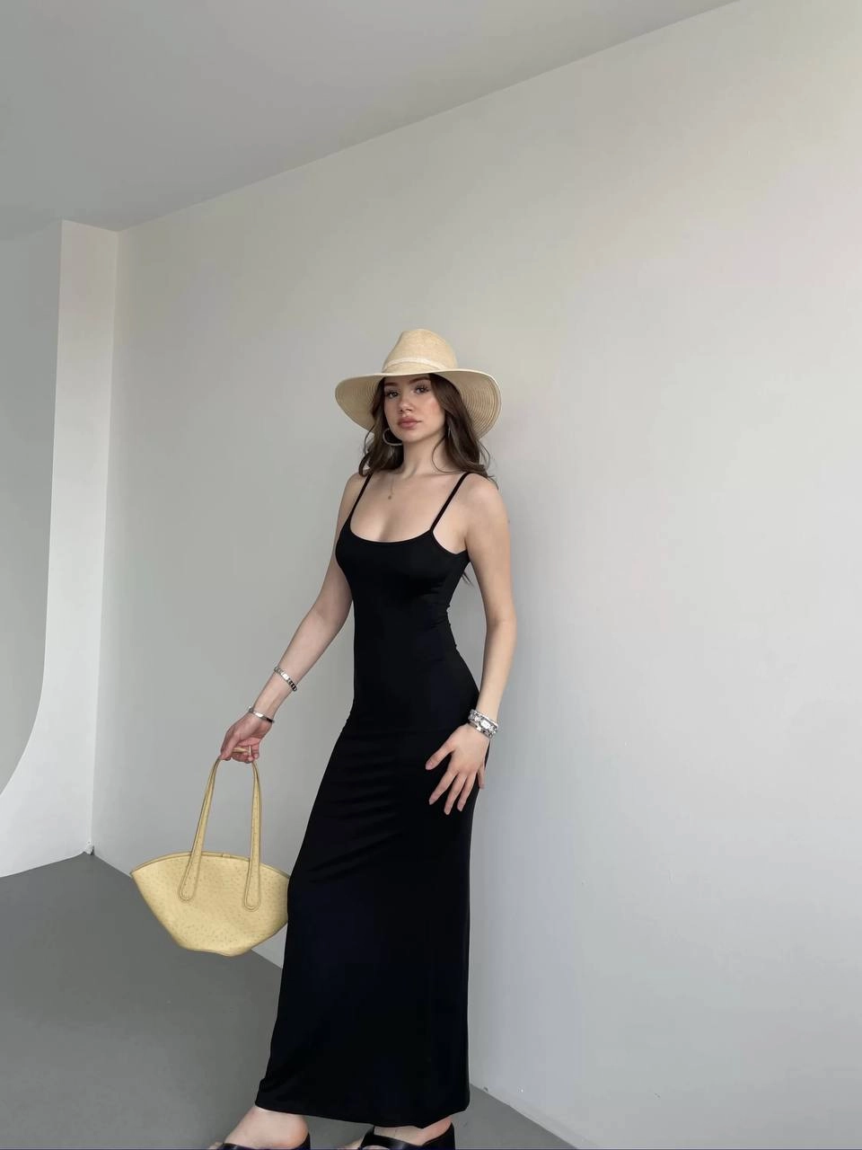 الموديل ترتدي مقاس 36 – الطول 172 سم، الوزن 53 كغ، الصدر 83 سم، الخصر 70 سم، الورك 91 سم