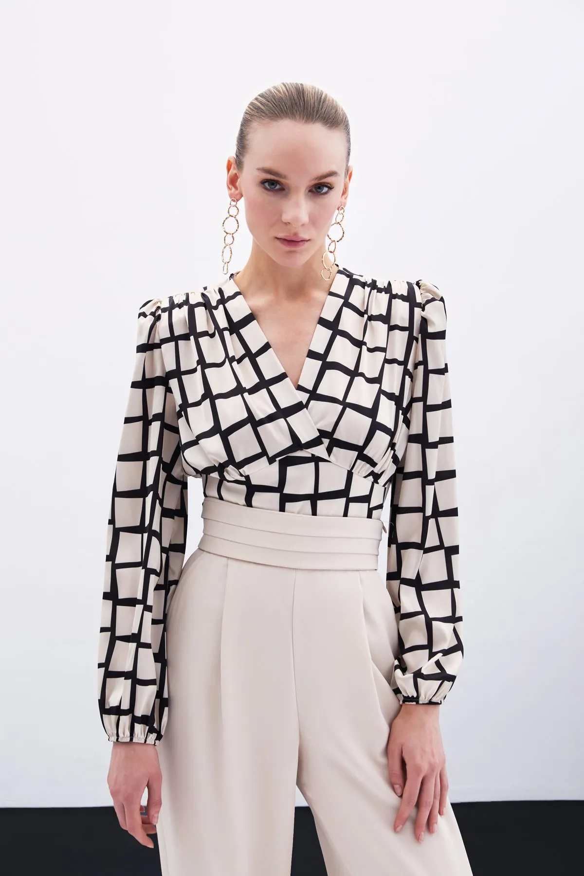 الموديل ترتدي مقاس S – الطول 172 سم، الوزن 65 كغ، الصدر 85 سم، الخصر 66 سم، الورك 93 سم