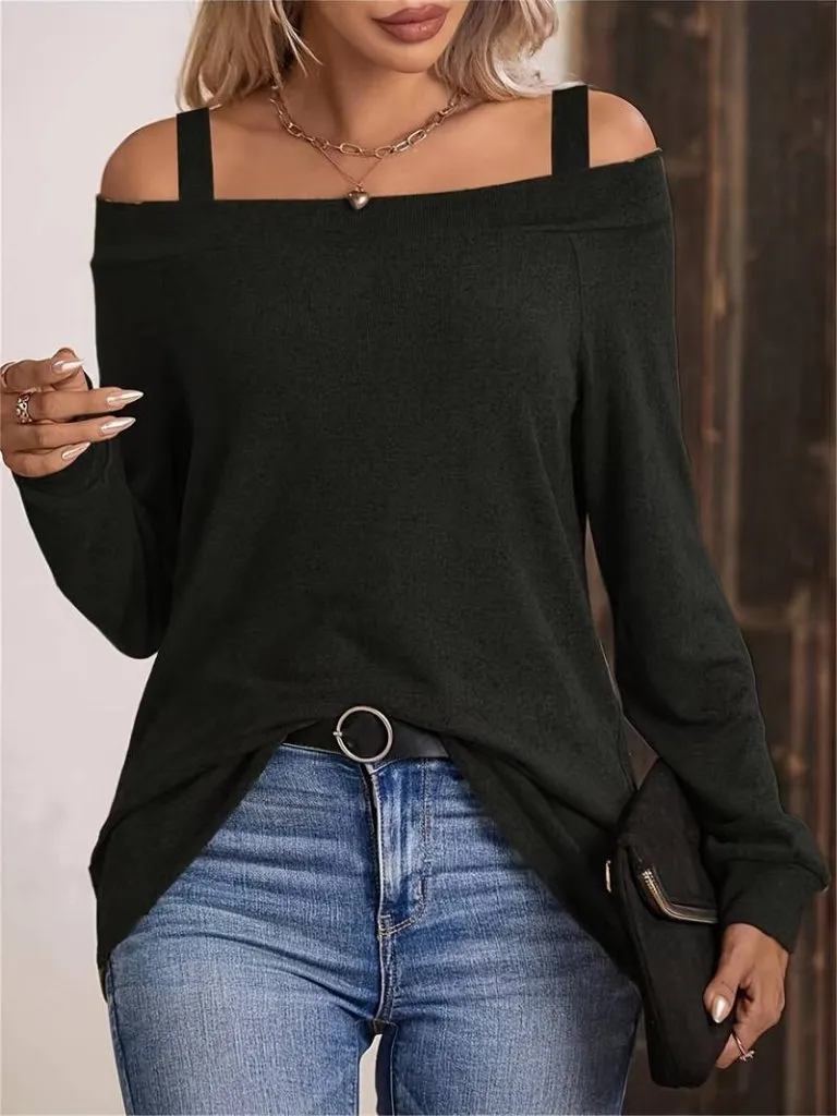 بلوزة مريحة بكتف مكشوف وثنيات ناعمة مع قصة ضيقة ولمسة معدنية مميزة لستايل يومي صيفي أنيق.
