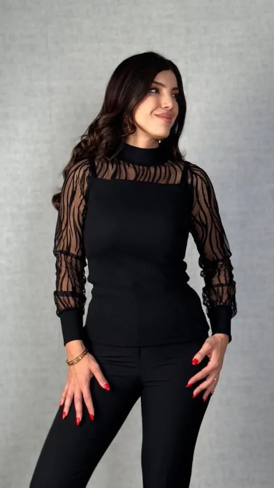 بلوزة محبوكة بنمط هندسي وتفاصيل حجرية للنساء