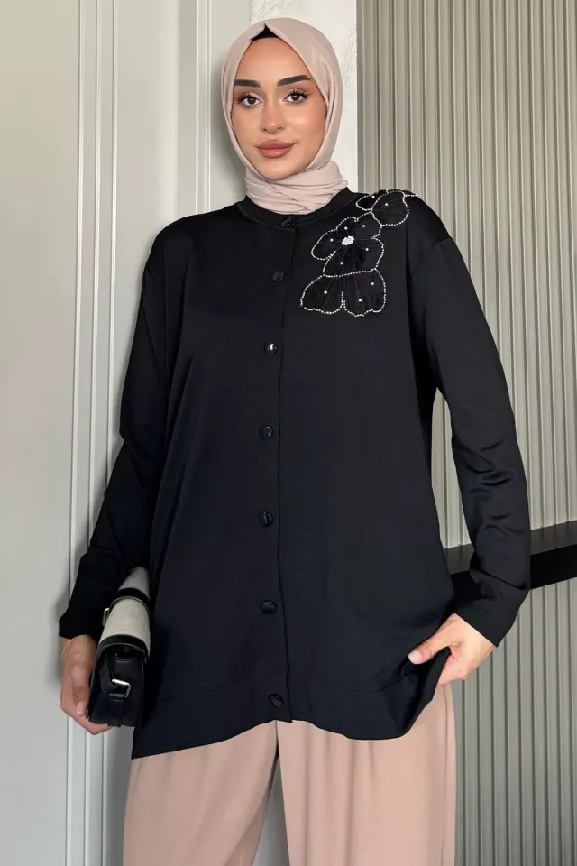 الموديل ترتدي مقاس L – الطول 170 سم، الوزن 55 كغ، الصدر 84 سم، الخصر 65 سم، الورك 92 سم